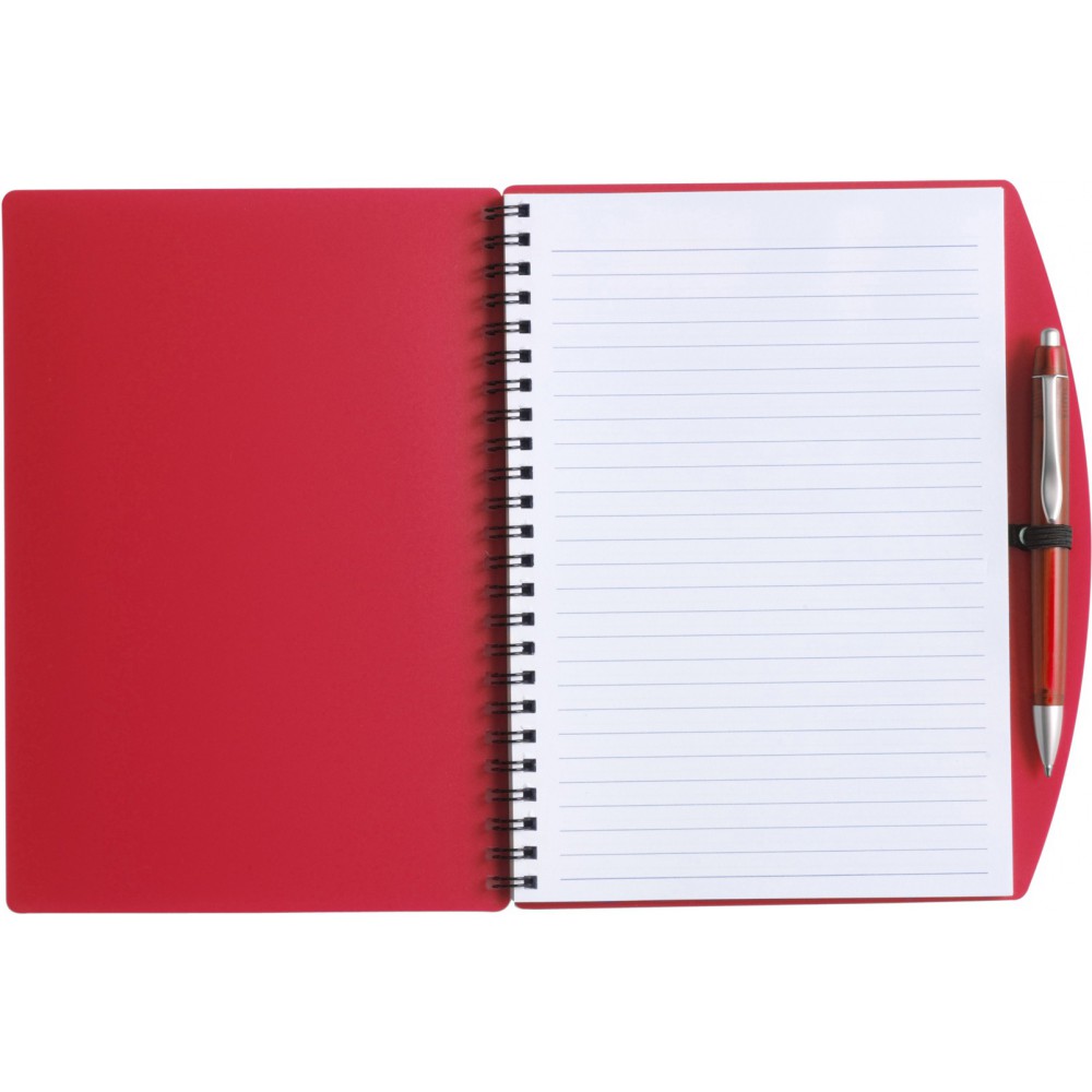 A5-ös spirálfüzet PP borítóval, 65 lapos vonalas tömbbel, műanyag tollal, kék tollbetéttel. Emblémázás: Tamponnyomás