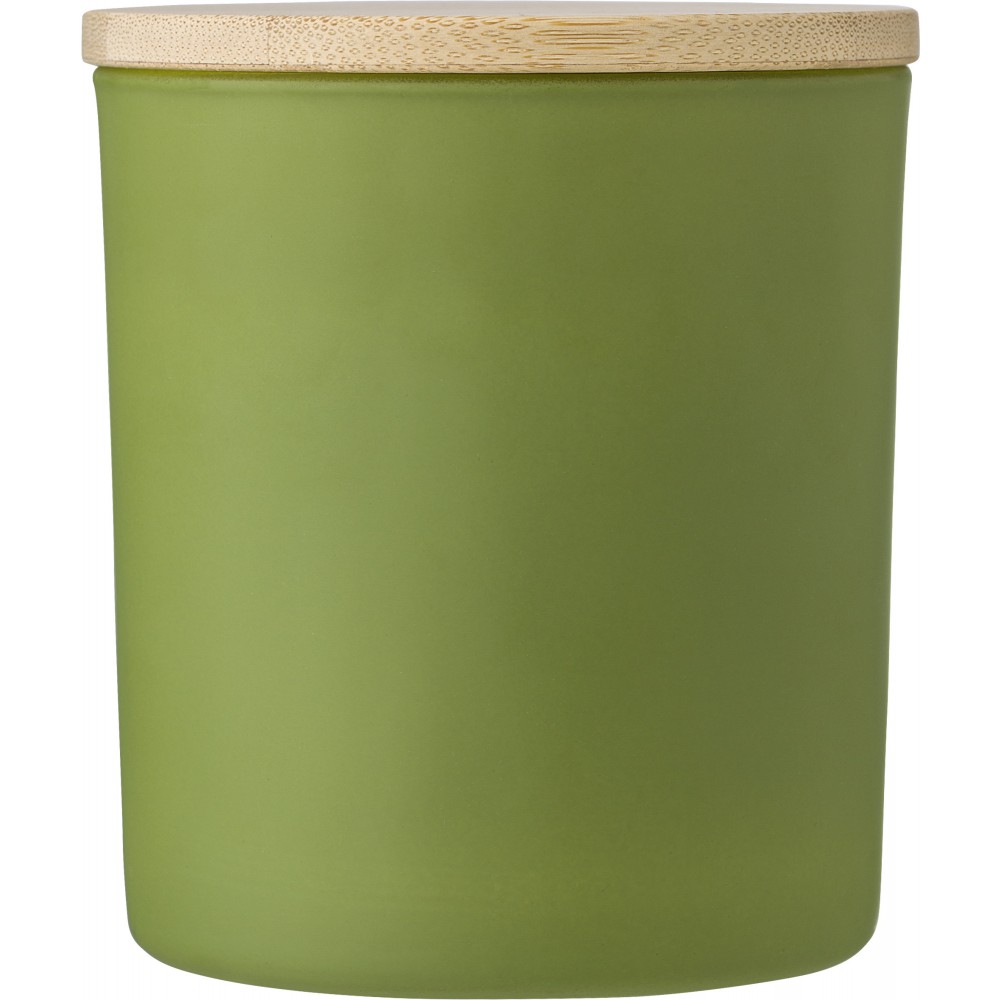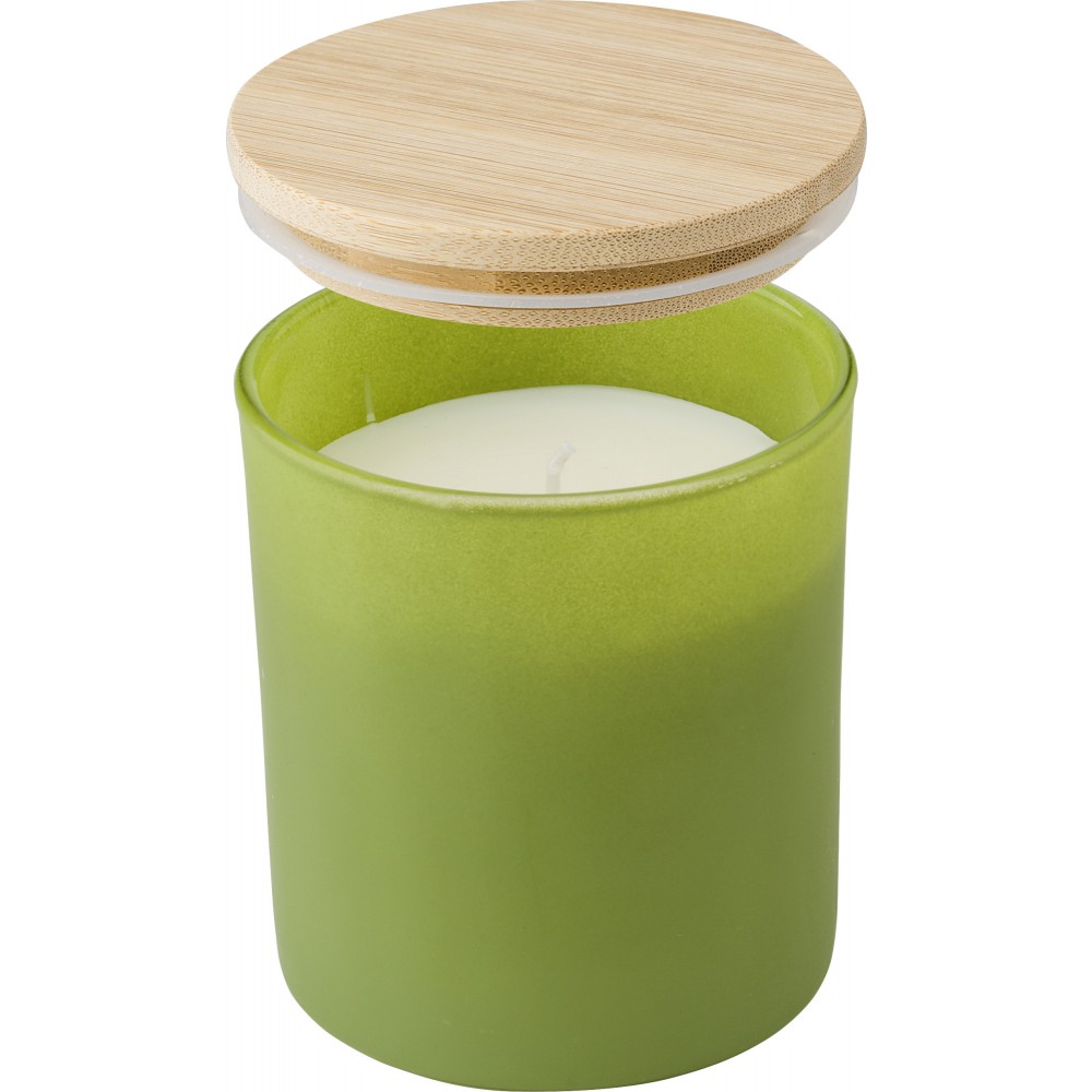 Üveggyertya növényi alapú viasszal és bambusz fedővel. A gyertya főleg növényi viaszt (karnaubaviaszt) tartalmaz, égési ideje körülbelül 33 óra. Négy illat az üveg színétől függően: fahéj (piros), vanília (fehér), szantálfa (fekete) és jázmin (zöld). Egyenként, fehér papírpalástba csomagolva. Emblémázás: Gravírozás, Tamponnyomás, UV nyomtatás