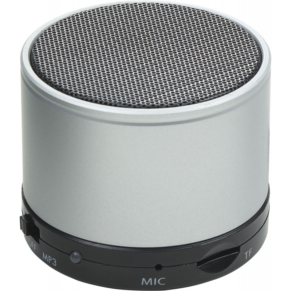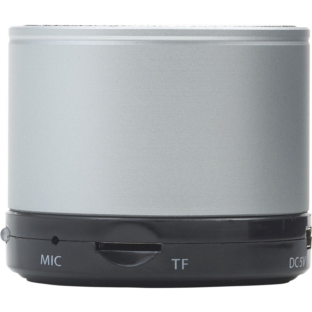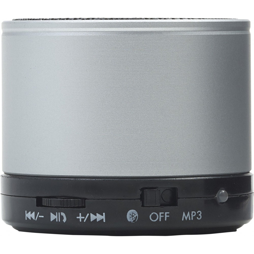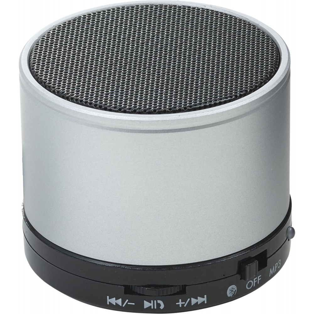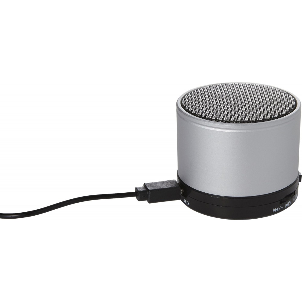 Vezeték nélküli hangszóró hangerő szabályozóval, előre- és visszaléptető gombbal, valamint módválasztó gombbal: MP3, vezeték nélküli mód és kikapcsolás. A töltőkábelt tartalmazza. Színezett fém anyag. Emblémázás: Tamponnyomás, UV nyomtatás