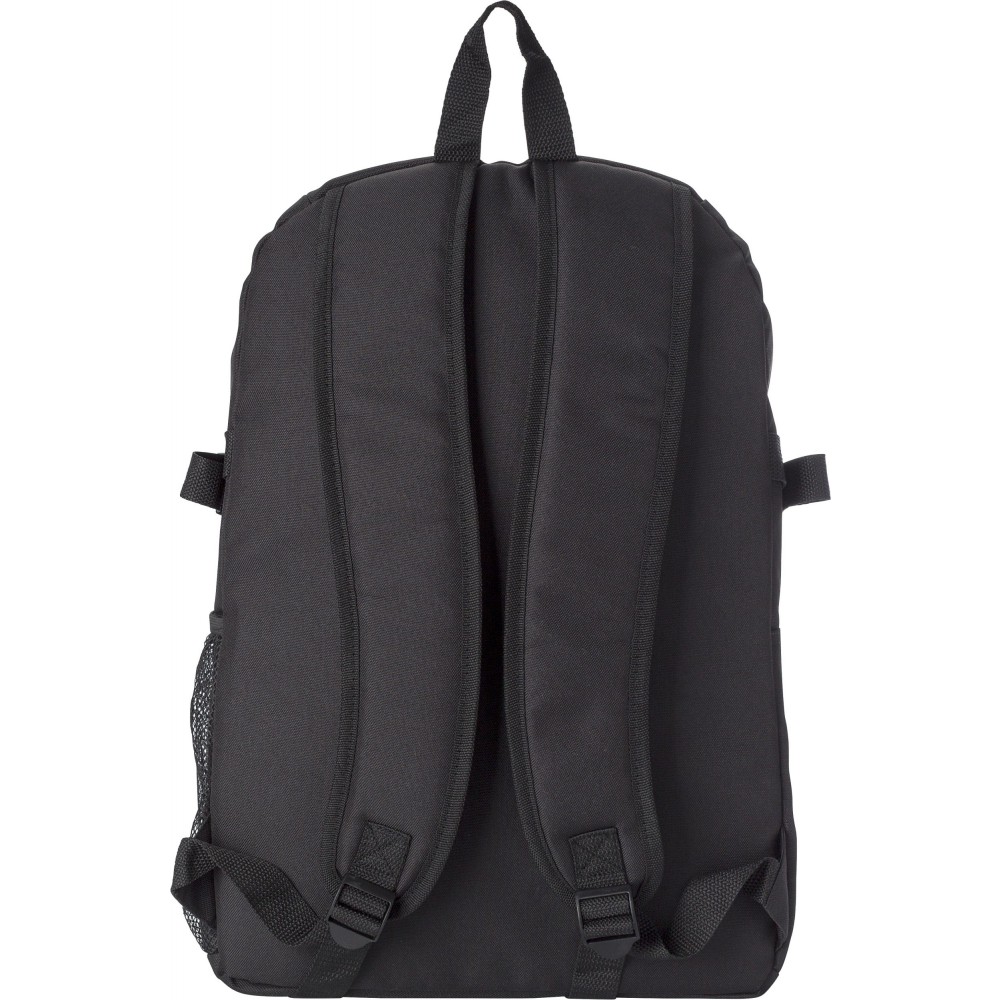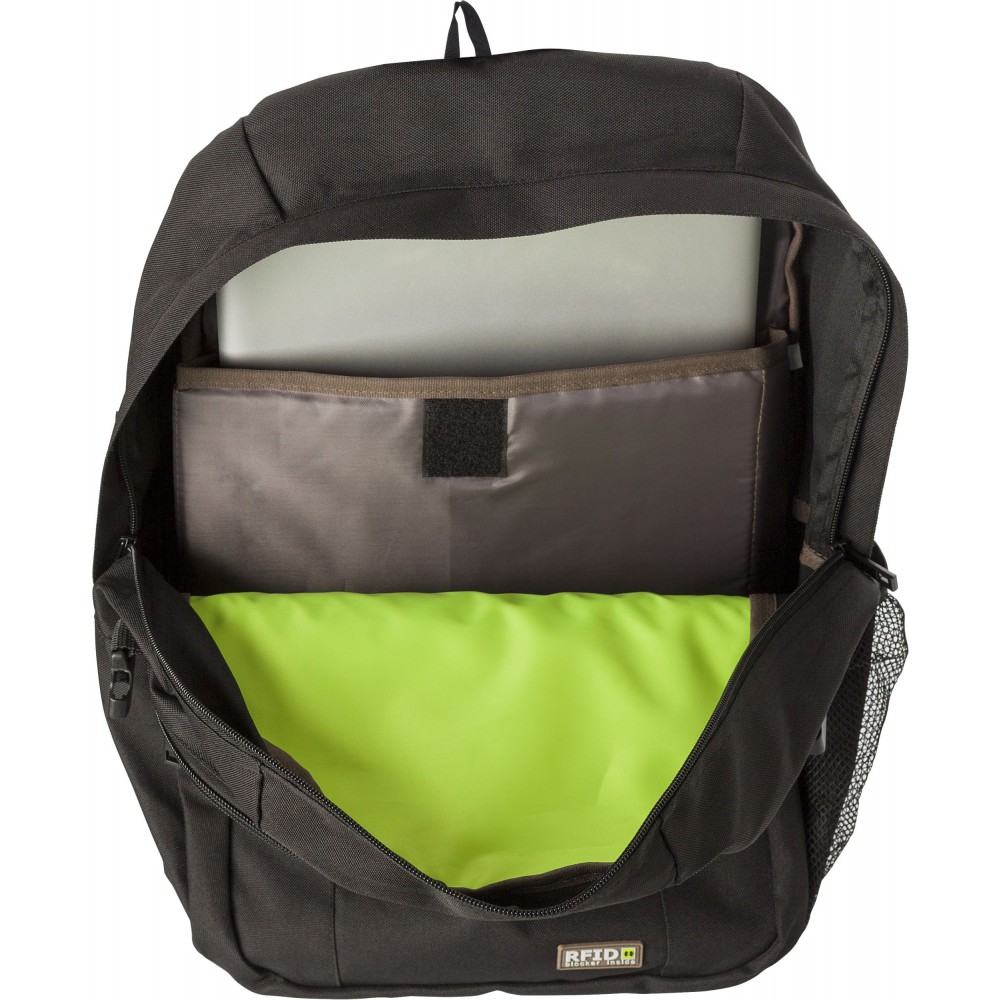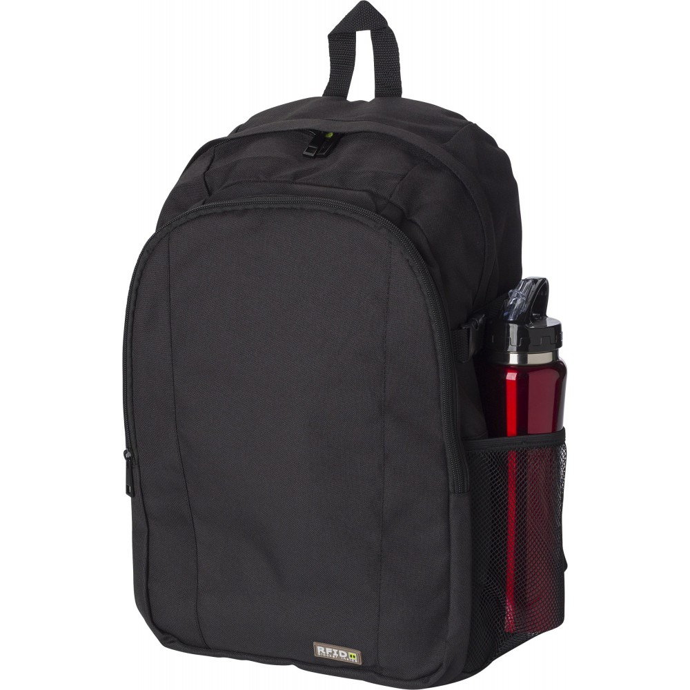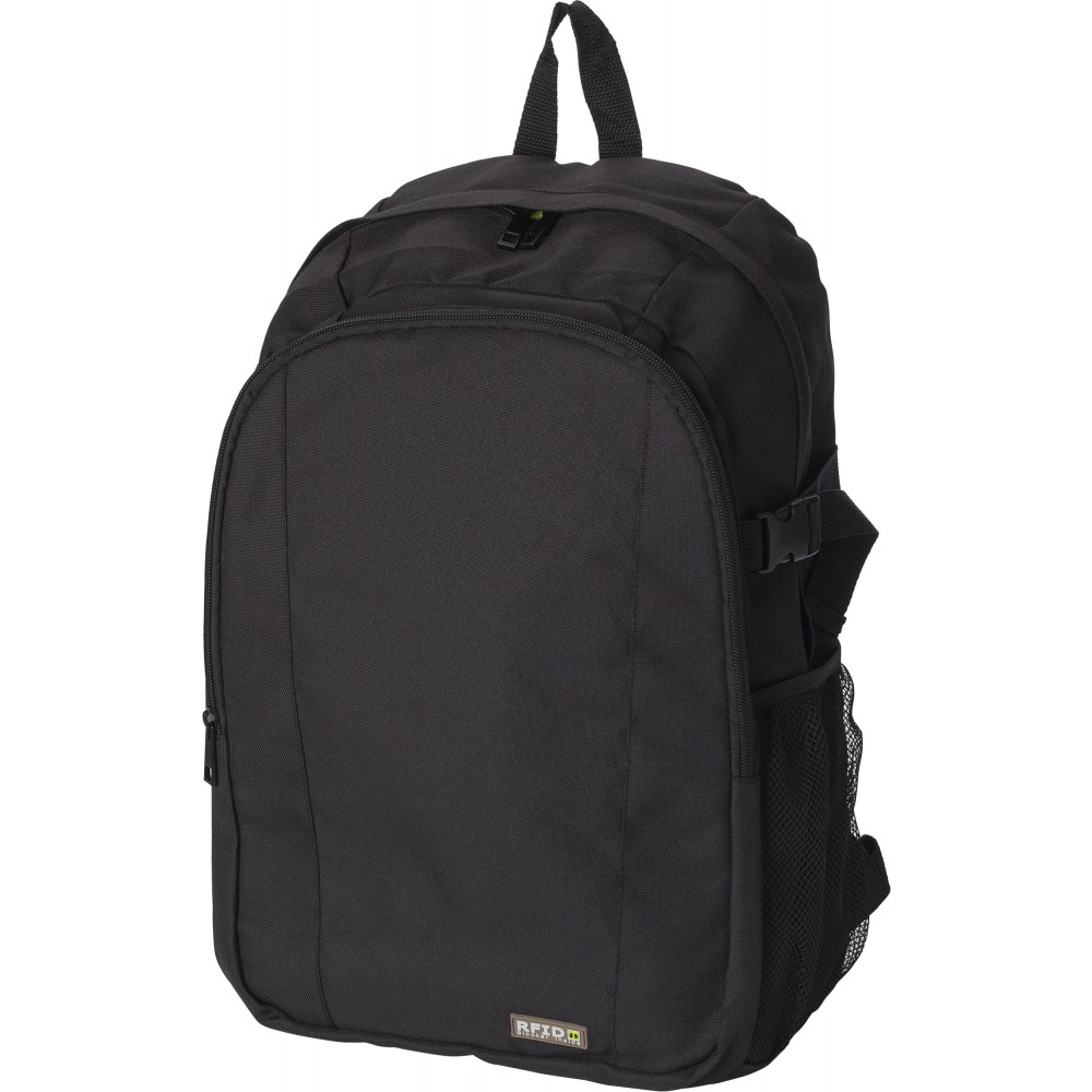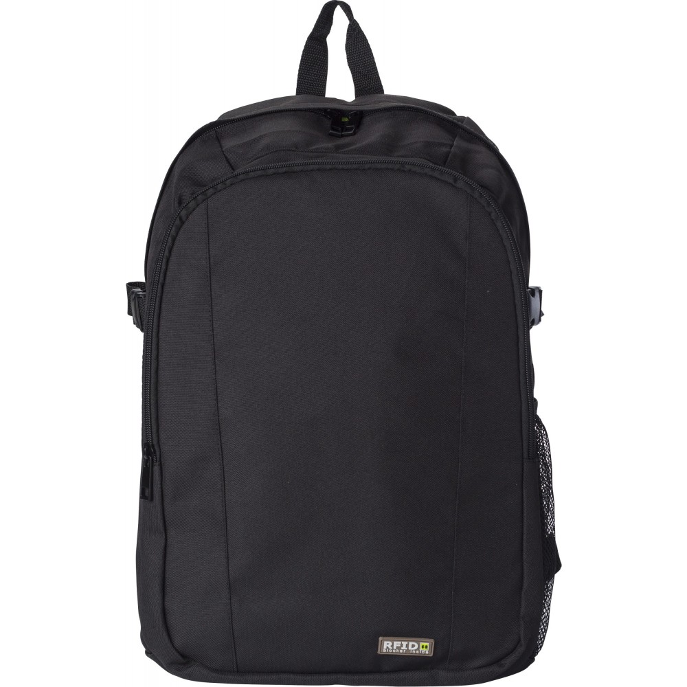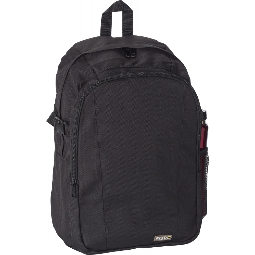 Hátizsák RFID blokkolóval. Az első zseb és a fő rekesz cipzáras. Belül több zseb biztosítja a kényelmes használhatóságot. Oldalhálós külső zseb. A pántok párnázottak és állíthatóak. 600D poliészter. Emblémázás: Szitanyomás