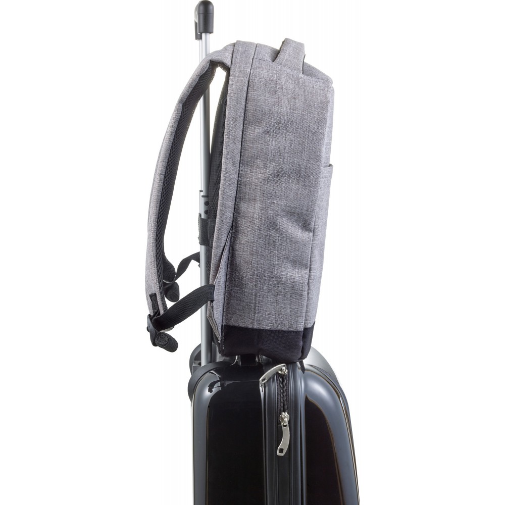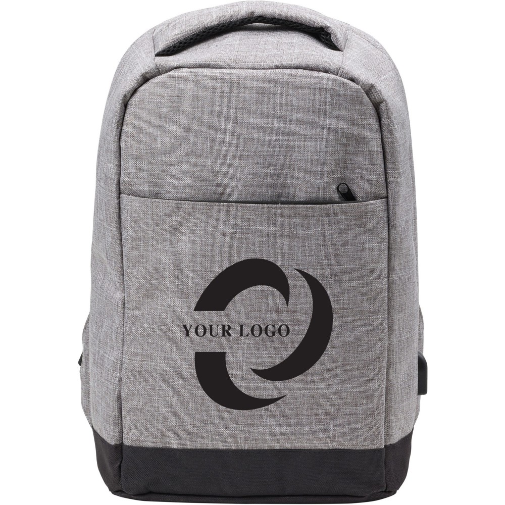 Hátizsák lopás elleni védelemmel, laptoptartóval, sok belső zsebbel, külső cipzáros zsebbel és az oldalán USB csatlakozással. 600D poliészter és PVC hátoldal. 13"-es laptop fér bele. Emblémázás: Hímzés, Szitanyomás