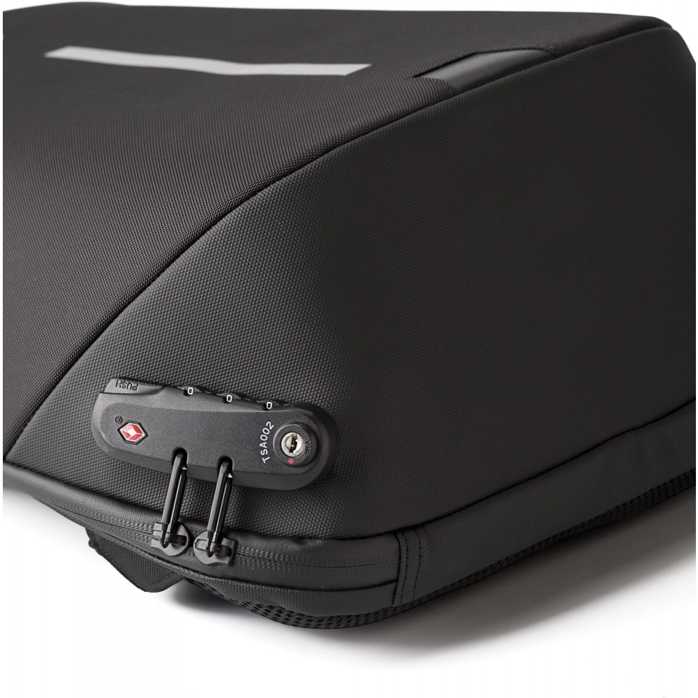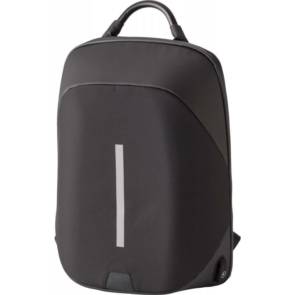 Hátizsák több belső zsebbel, párnázott rész a 15"-es laptop számára, párnázott, állítható vállpánt. 3 karakteres számkonbinációs lakat, fém fül, USB port és vezeték, fényvisszaverő csík, könnyített súlyeloszlást biztosító kialakítás. 1200D nylon anyag. Emblémázás: Szitanyomás