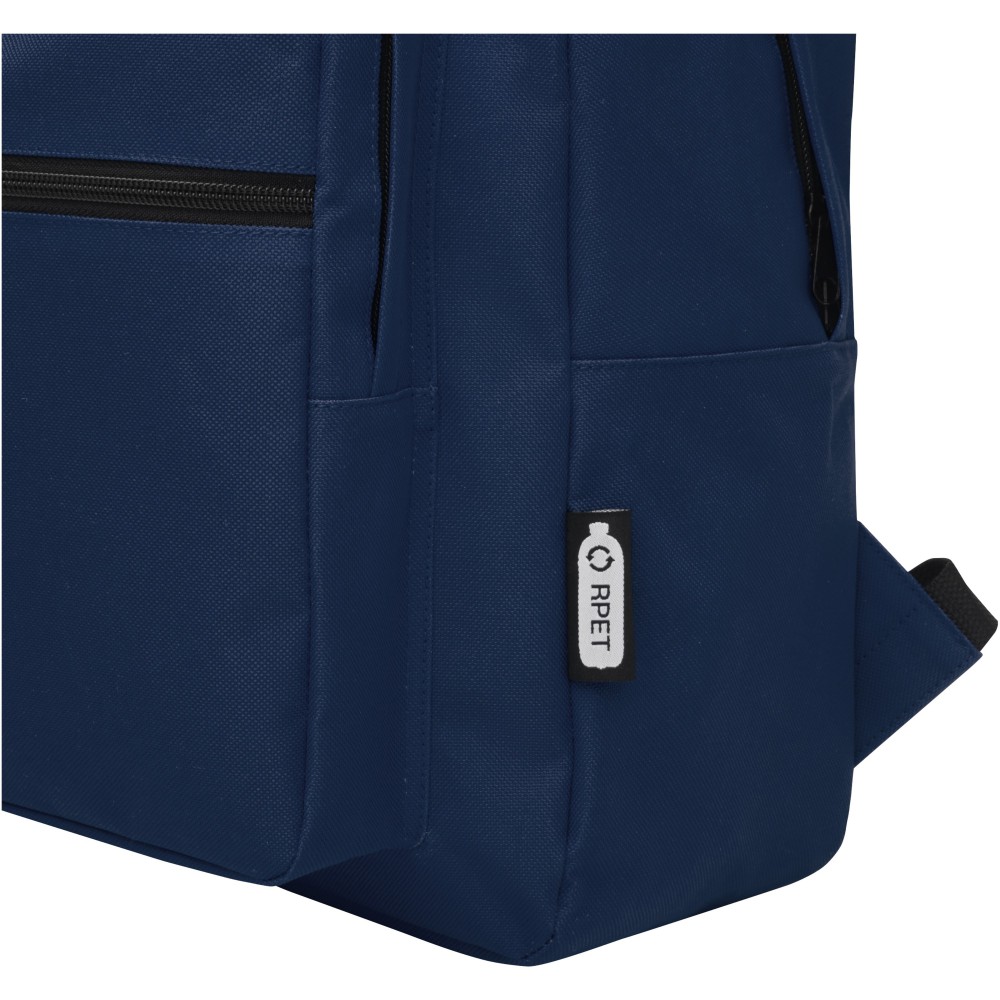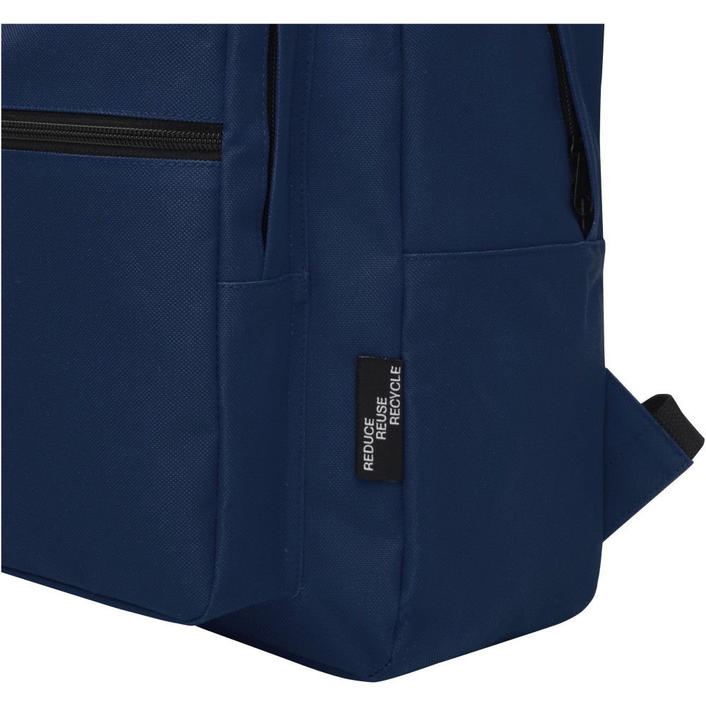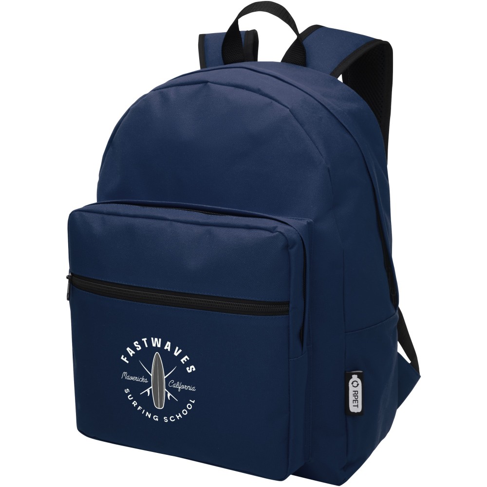 Hátizsák 100%-ban újrahasznosított műanyagból készült, amivel hozzájárulunk a műanyag hulladék csökkentéséhez. Állítható vállpántok, 2 cipzáras rekesz és egy első cipzáras zseb. Körülbelül 15 palack újrahasznosításából gyártott termék. RPET. Emblémázás: Szitanyomás