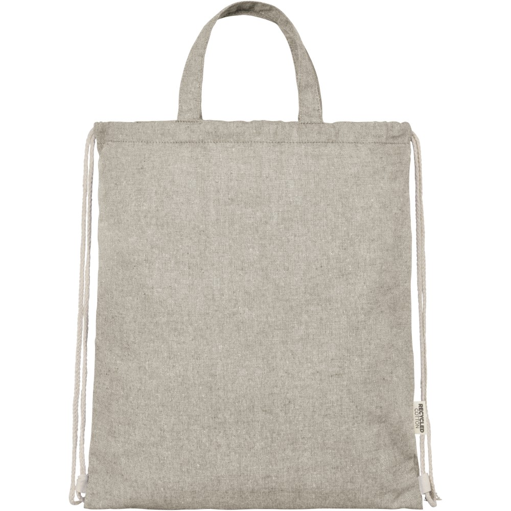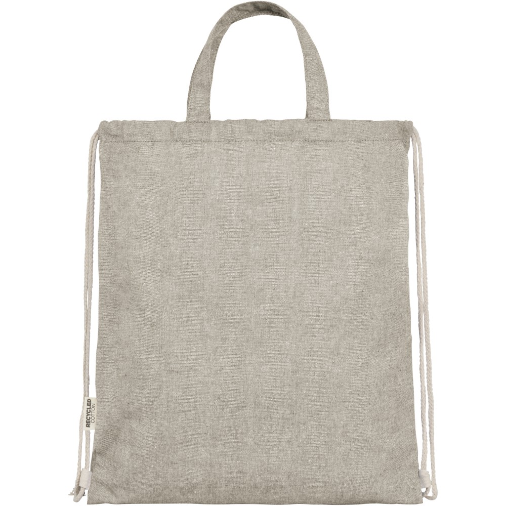 Zsinóros hátizsák 150 g/m2 súlyú újrahasznosított pamut-poliészter keverékből. Tágas, pamut zsinórral záródó, természetes színű fő rekesz. Az újrahasznosított pamutot a textilgyárakban a vágási folyamat során keletkező hulladékból állítják elő. A hasonló színeket összekeverik, így nincs szükség további festésre. Az újrahasznosított pamut természetéből adódóan nagyon enyhe színeltérések előfordulhatnak. Minden hátizsákhoz egy Aware nyomjelző is tartozik, ez az innovatív funkció lehetővé teszi a felhasználók számára, hogy egy QR-kód segítségével nyomon követhessék a termék eredetét és útját, növelve az ellátási lánc átláthatóságát és elősegíti a termék és a gyártási folyamat közötti szorosabb kapcsolatot. Teherbírás: 5 kg. Emblémázás: Szitanyomás