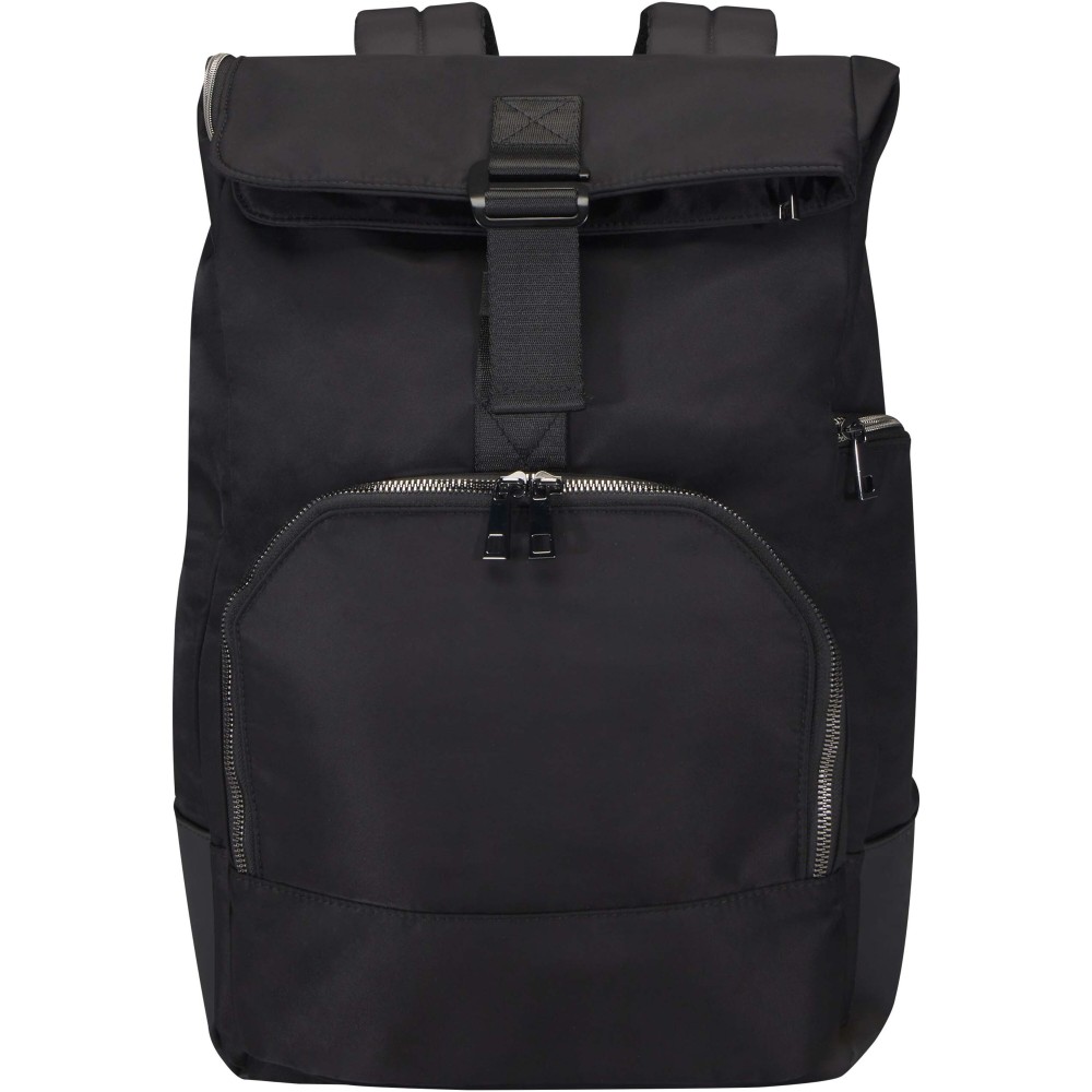 A Rhine rolltop hátizsák elegáns stílusával és sokoldalúságával tökéletesen illeszkedik a munkához és a szabadidős tevékenységekhez egyaránt. Kiváló minőségű, GRS tanúsítvánnyal rendelkező újrahasznosított nejlonból készült, puha RPET béléssel és prémium műbőr elemekkel. A hátizsák dedikált, 15?-os laptoprekesszel, valamint két további zsebbel rendelkezik elektronikus kiegészítők számára. A főrekesz praktikus L-alakú cipzáras nyílással és két zsebbel van ellátva, emellett található benne egy cipzáras rendszerező elülső zseb és egy oldalzseb is. A maximális hordozási kényelmet a párnázott, állítható vállpántok és a PU bevonatú felső fül biztosítja. Űrtartalma: 18 liter. Teherbírás: akár 10 kg. PVC-mentes. Emblémázás: Szitanyomás