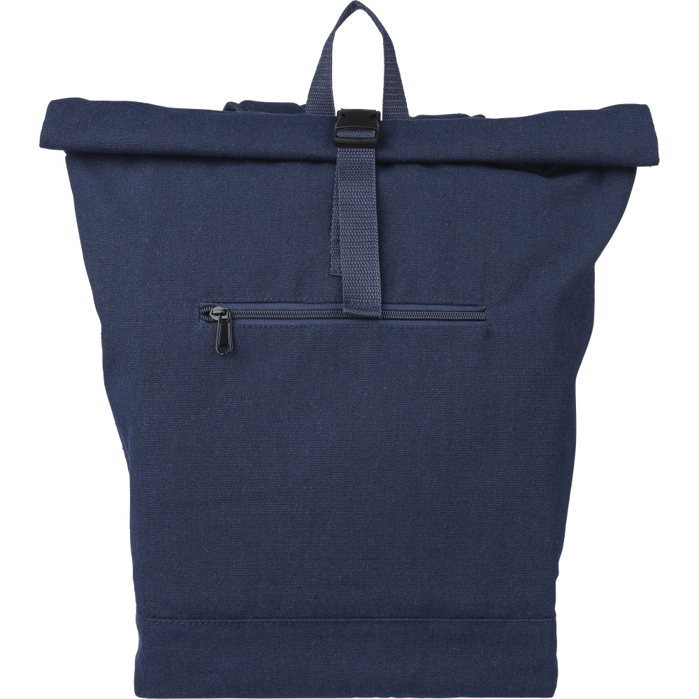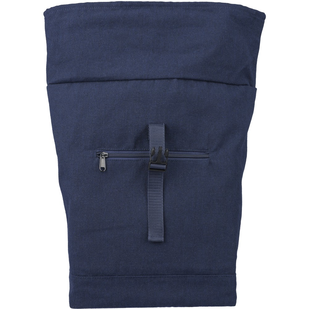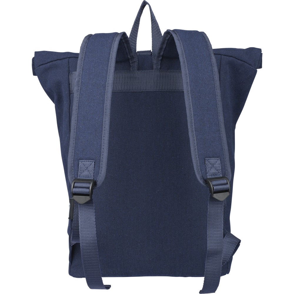 Rolltop hátizsák 330 g/m2 újahasznosított policotton anyagból, 210D poliészter béléssel és műanyag csattal. 15 literes űrtartalommal, egy nagy cipzáras rekesszel, 15"-es laptoptartó résszel, két belső és egy külső rekesszel. Tetején hordozófüllel, párnázott, állítható vállpánttal és egy kicsi, cipzáras elsőzsebbel. Teherbíró képessége 14 kg. Címkét tartalmaz. Emblémázás: Szitanyomás
