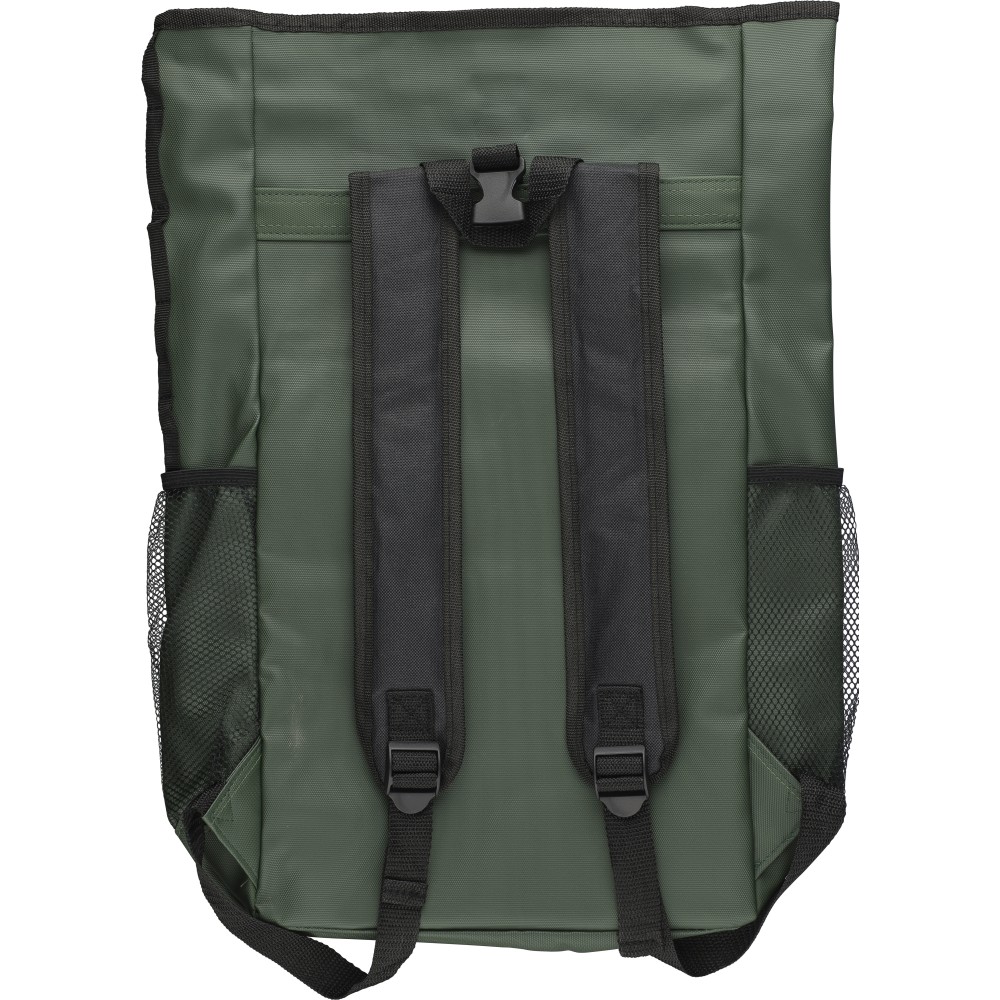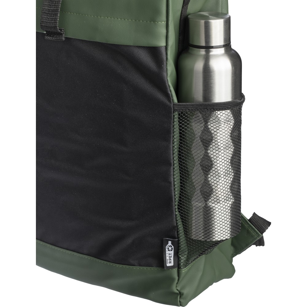 600D rPET poliészter roll-top hátizsák. PU bevonat teszi vízlepergetővé. Rejtett cipzáras első zsebbel, hálós oldalzsebekkel, 15 -es laptop számára kialakított tárolórésszel, 5 tárolórekesszel, állítható vállpánttal. Kapacitása 25 liter, teherbírása 15 kg. Oldalán rPET címkével. Emblémázás: Szitanyomás