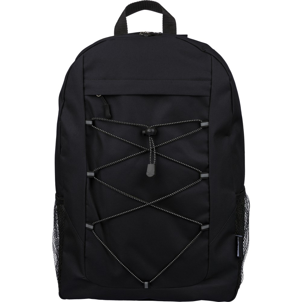 RPET poliészter 600D anyagból készült hátizsák húzózsinóros záródással és nagy cipzáras fő rekesszel. Hálós oldalzsebekkel, rugalmas elülső pántokkal, dekorációhoz kialakított kis elülső cipzáras zsebbel és állítható vállpántokkal rendelkezik. A terméken rPET alapanyagra utaló címke található.