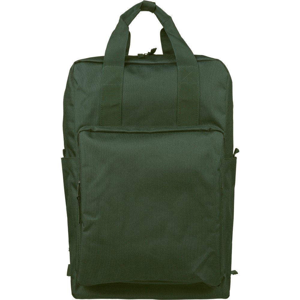 Újrahasznosított 900D poliészterből készült hátizsák, 210D béléssel és rPET címkével. Tágas fő rekesszel rendelkezik, 16?-os laptop számára kialakított külön zsebbel, elülső rekesszel, két oldalzsebbel, valamint bőröndre rögzíthető pánttal (trolley strap). Felső fogantyúi gombbal összefoghatóak, vállpántjai szellőző kialakításúak a kényelmes viselet érdekében.
