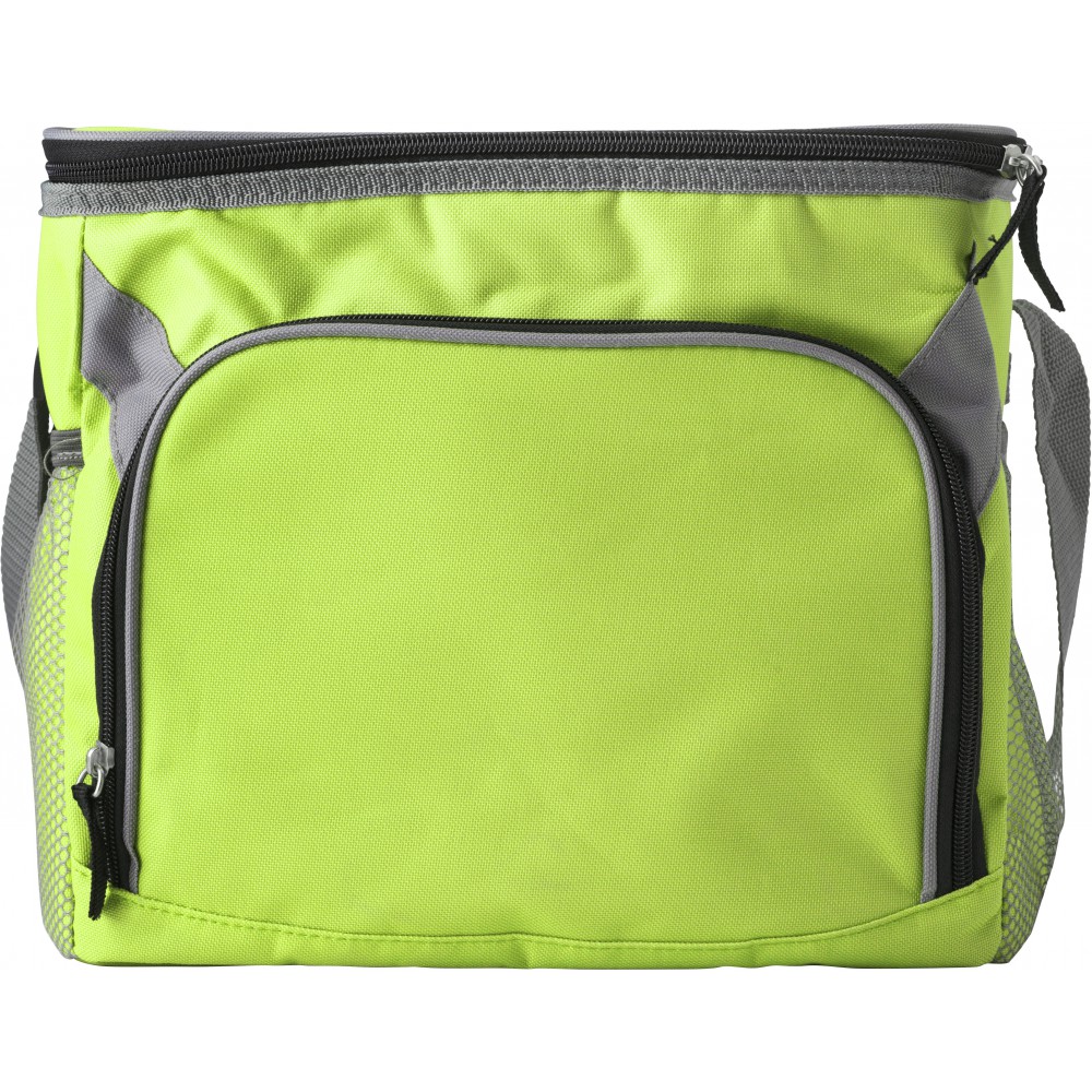Hűtőtáska nagy cipzáros elsőzsebbel és mindkét végén hálós zsebekkel. 600D poliészter. Emblémázás: Szitanyomás