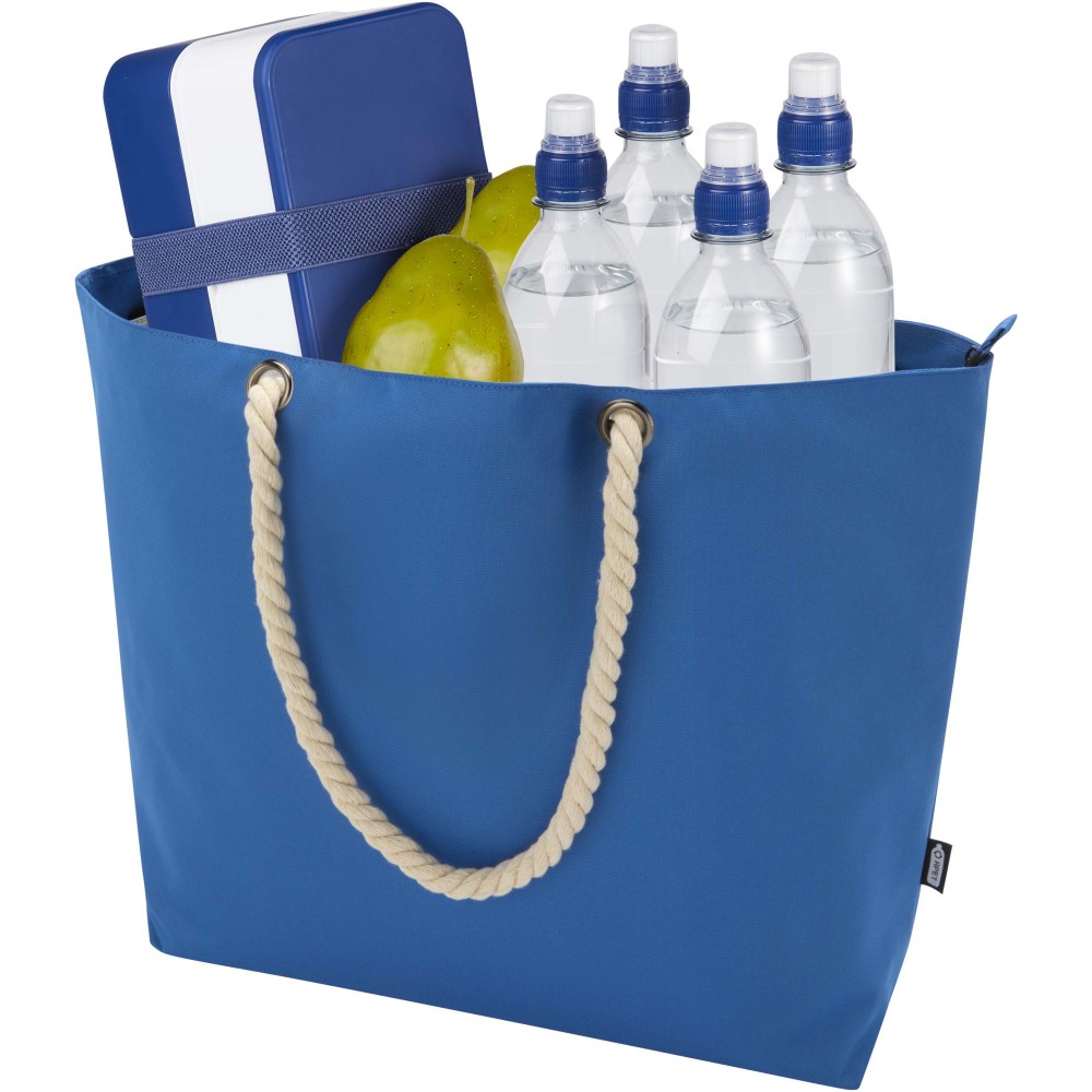 A Panama hűtőtáska GRS tanúsítvánnyal rendelkező újrahasznosított poliészterből készült, és nagy, cipzáras főrekesszel van ellátva. Kiváló minőségű alumínium fóliával bélelt belső résszel és pamut fülekből áll. Ideális bevásárláshoz, strandoláshoz vagy egy parkbéli kiránduláshoz. Űrtartalma: 23 liter. Teherbírás: akár 10 kg. PVC-mentes. Emblémázás: Szitanyomás