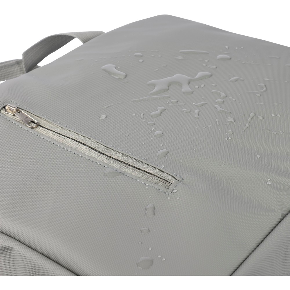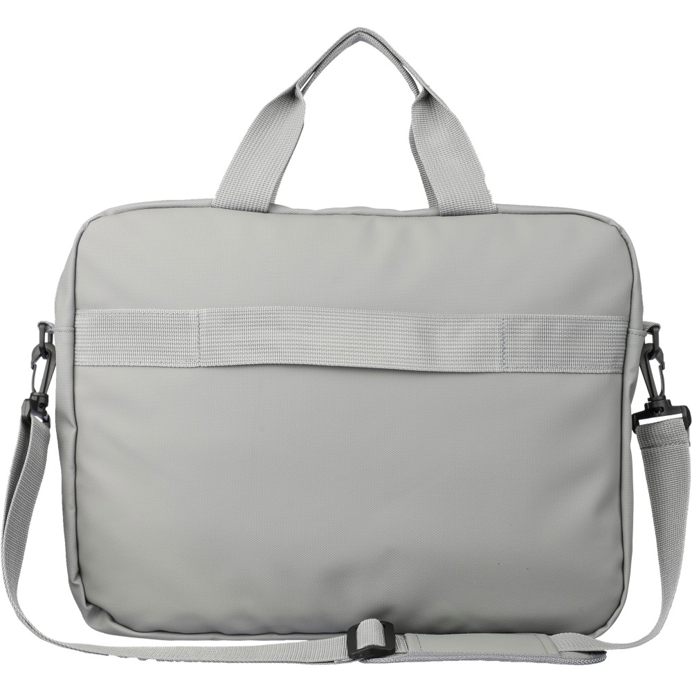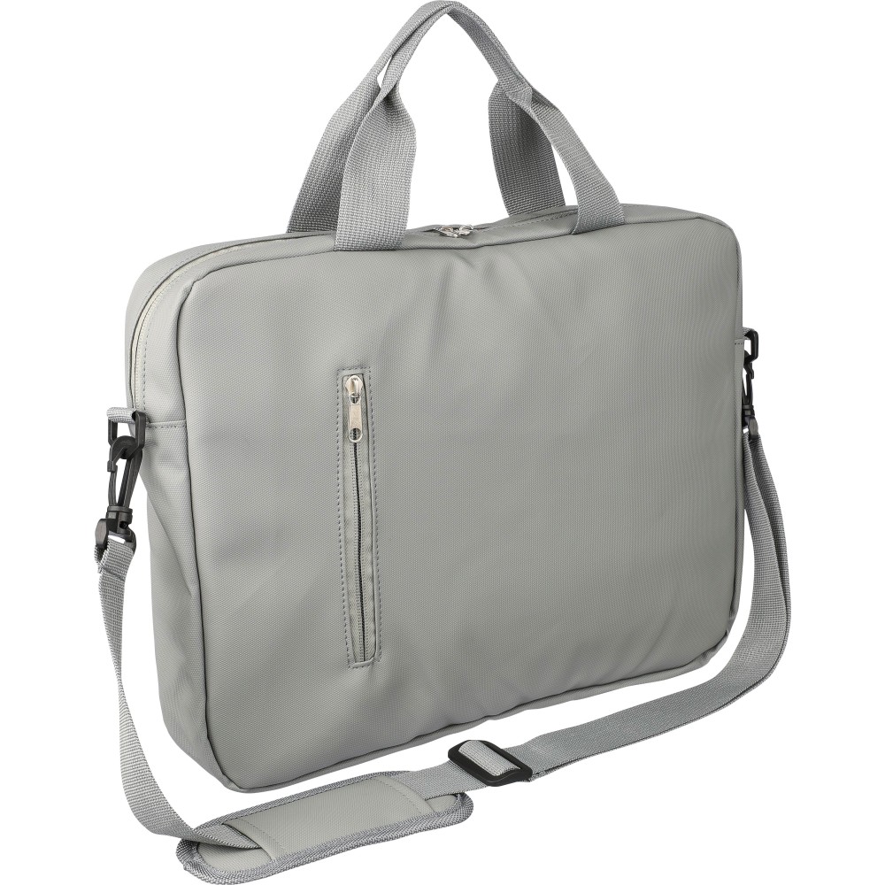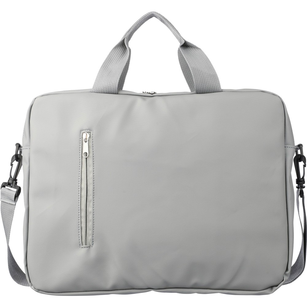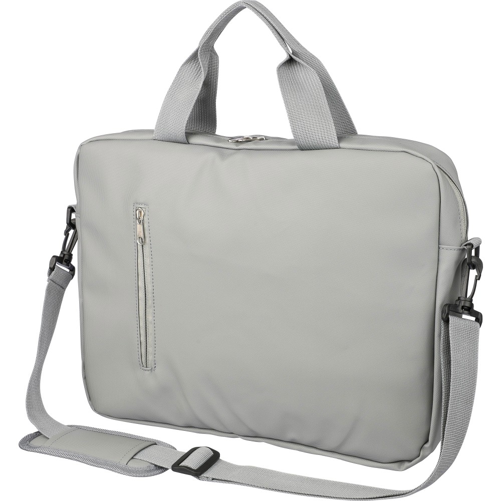 Laptoptáska 15"-es laptophoz PU anyagból, két cipzáras első zsebbel, egy nagy cipzáras rekesszel és tépőzáras laptop résszel, valamint több belső zsebbel. Állítható vállpántokkal és két fogantyúval rendelkezik. Vízlepergető. Anyaga: PU. Emblémázás: Szitanyomás
