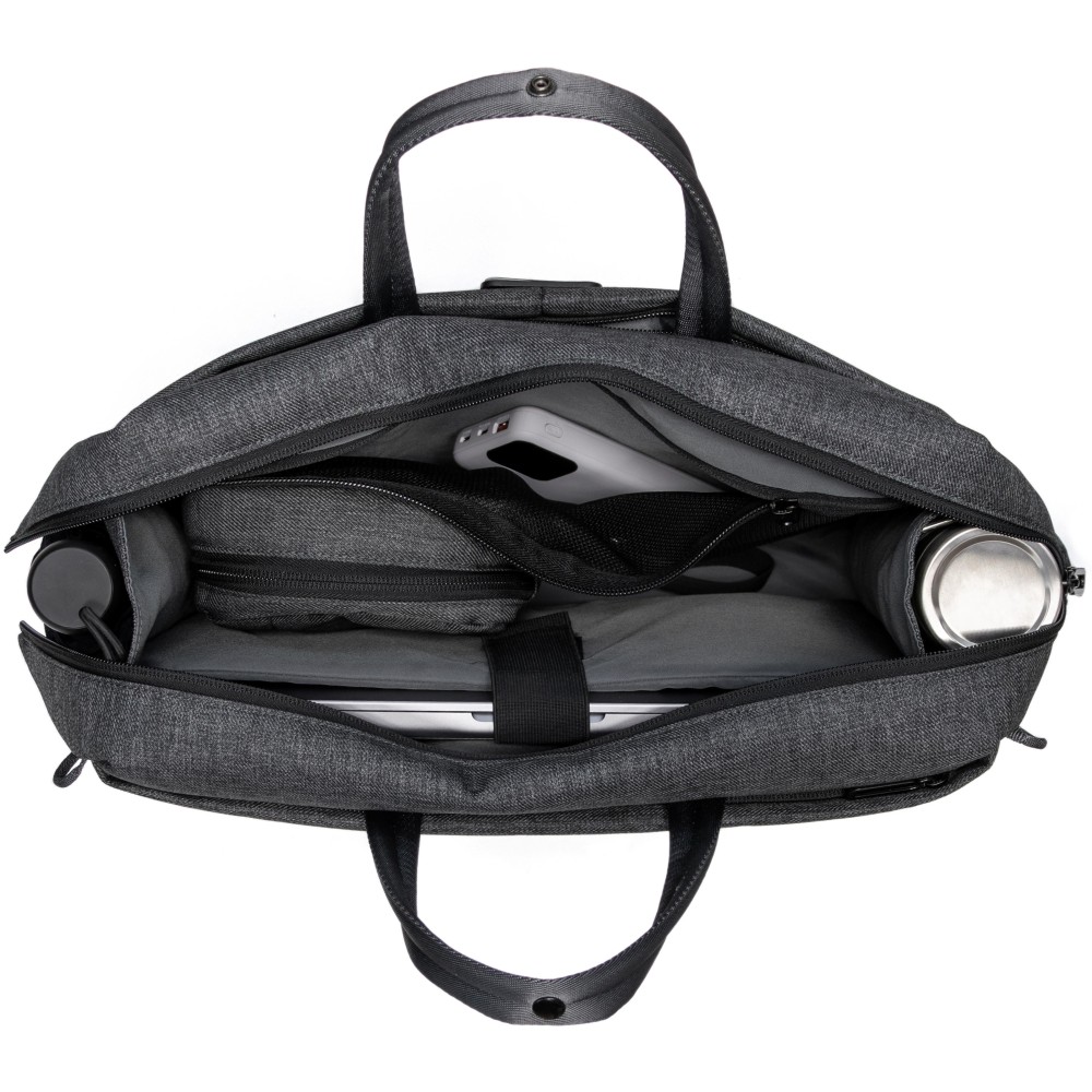 Újrahasznosított PET palackok felhasználásával készült BrandCharager laptoptáska 3 hordozási funkcióval: kézben, vállon vagy testen keresztbe vetve is viselhető. 16"-es laptop számára megfelelő tárolórésszel, több zsebbel és palack vagy esernyő számára megfelelő oldalzsebekkel, cipzáras záródással, hordozópánttal, 4 rekesszel. Strapabíró, víz- és folttaszító anyagból készült. Emblémázás: Szitanyomás