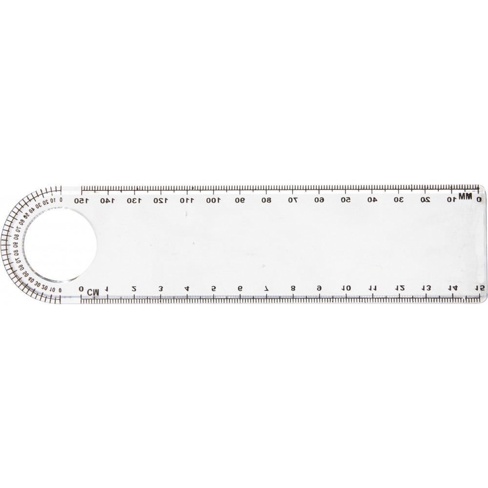 Átlátszó, 15 cm-es vonalzó nagyítóval és szögmérővel. Műanyag. Emblémázás: Szitanyomás, Tamponnyomás, UV nyomtatás