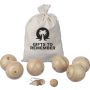 Fa labdajáték készlet 6 db, egyenként 7 cm átmérőjű labdával, egy kisebb, 2 cm-es golyóval és mérőzsinórral. Vászontasakba csomagolva. 4-6 játékos számára. Emblémázás: Szitanyomás