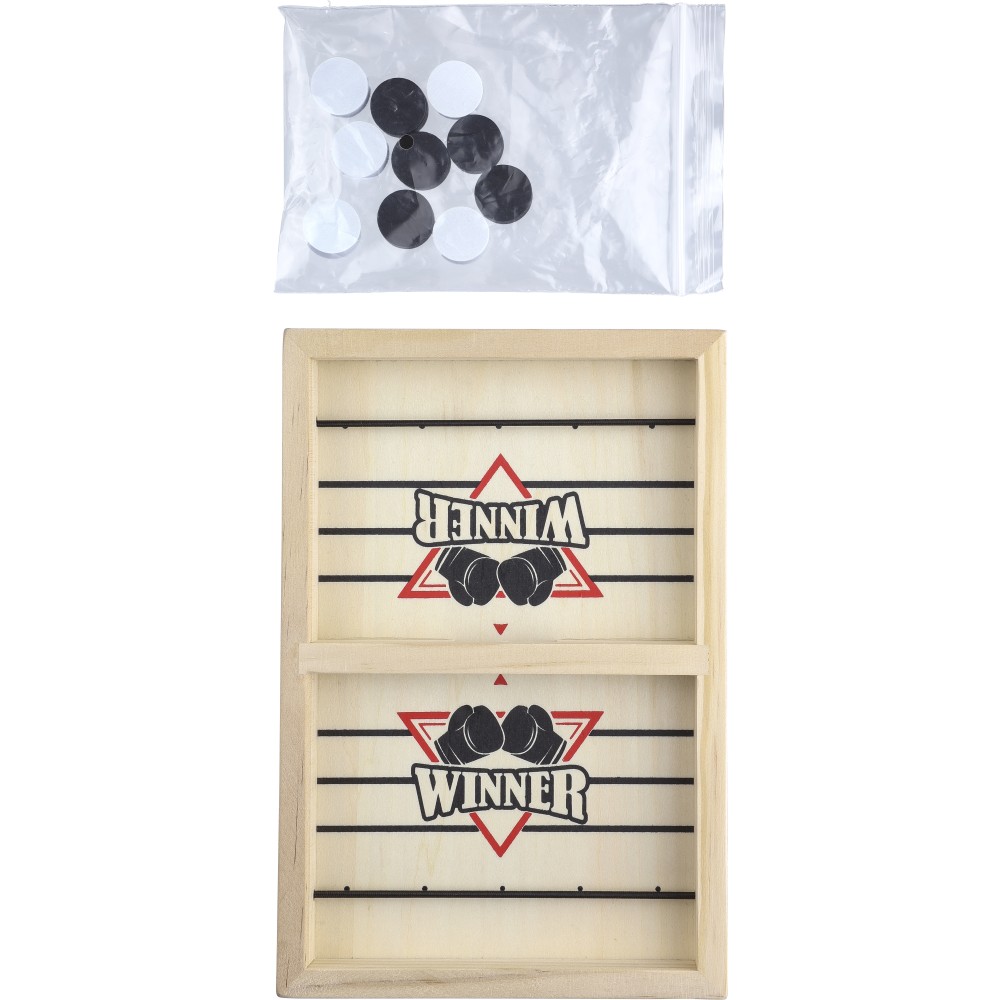 Tartalma 10 db korong (5 db fekete, 5 db fehér) és egy játékszabály. Gyorsan elsajátítható játék gyerekek és felnőttek számára. A flipperre és a gombfocira emlékeztető játék, amire sling puck néven keresve több videót találhattok. Csomagolása illusztrált barna papírdoboz. Emblémázás: Gravírozás, Tamponnyomás