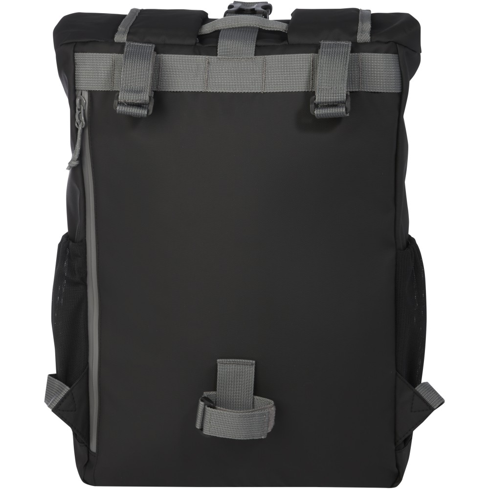 GRS tanúsítvánnyal rendelkező újrahasznosított anyagokból készült, vízálló, kerékpáros táska. Párnázott 15 -os laptop rekesszel, több zsebbel, állítható hurkokkal, valamint fényvisszaverő csíkokkal a láthatóság érdekében. Űrtartama: 20 liter. PVC-mentes. Emblémázás: Szitanyomás