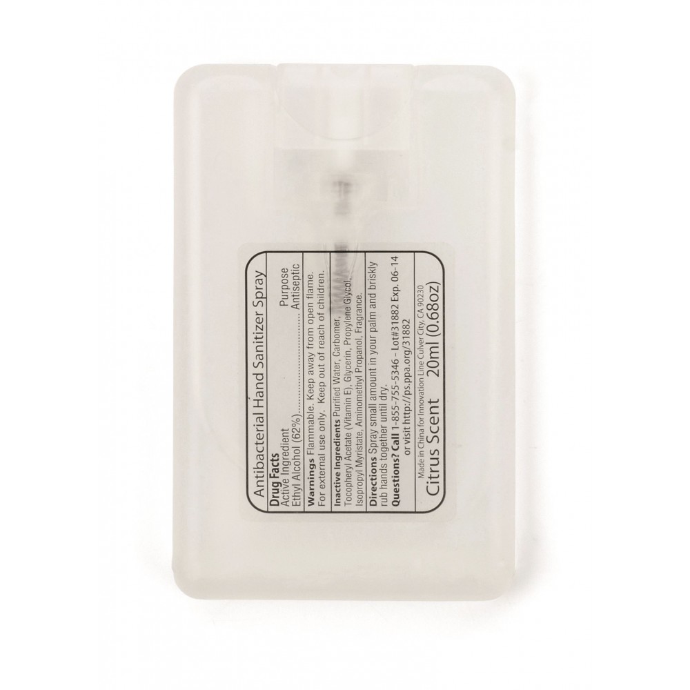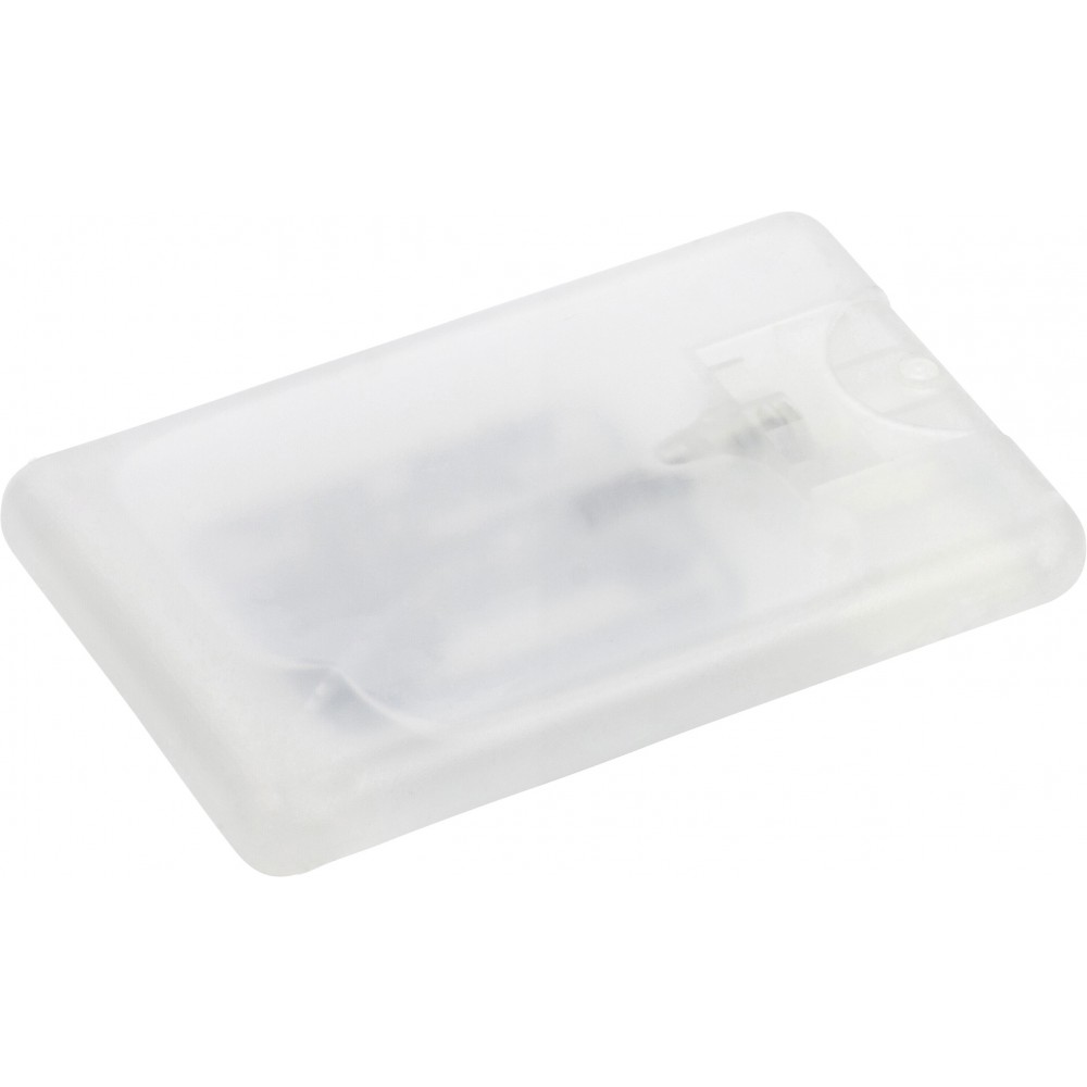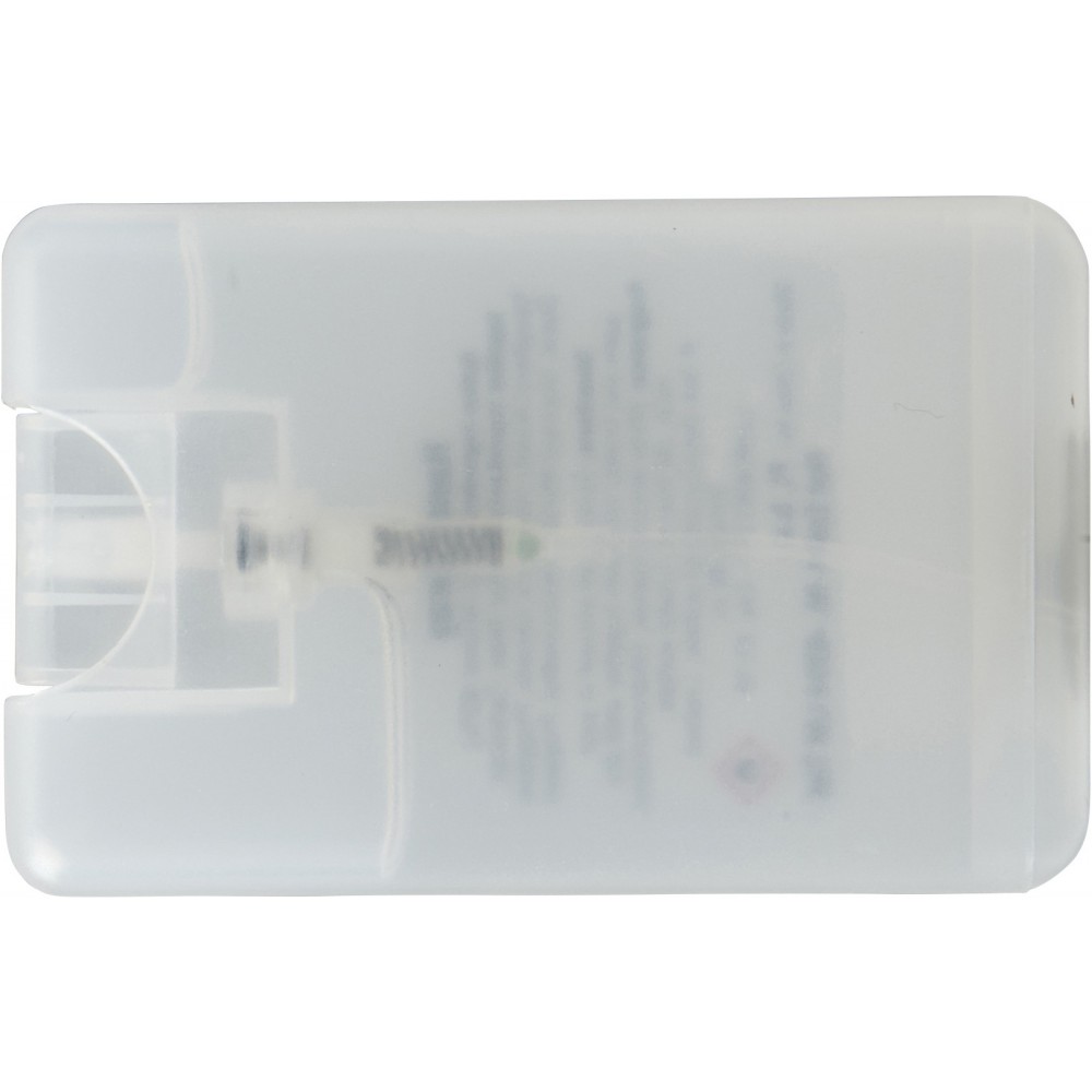 Kéztisztító spray áttetsző flakonban, 20 ml. Alkoholtartalom: 62%. Veszélyes áru, csomagban nem küldhető. Emblémázás: Tamponnyomás, UV nyomtatás
