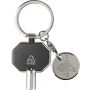 Újrahasznosított cinkötvözetből készült radiátor-légtelenítő kulcstartó bevásárlóérmével. 5×5 mm-es négyszögkulccsal rendelkezik, amely európai szabvány a radiátorok légtelenítéséhez. Erős fém kulcskarikával ellátva, a terméken recycled (újrahasznosított) alapanyagra utaló logó található. Illusztrációval ellátott barna karton borítékban csomagolva.