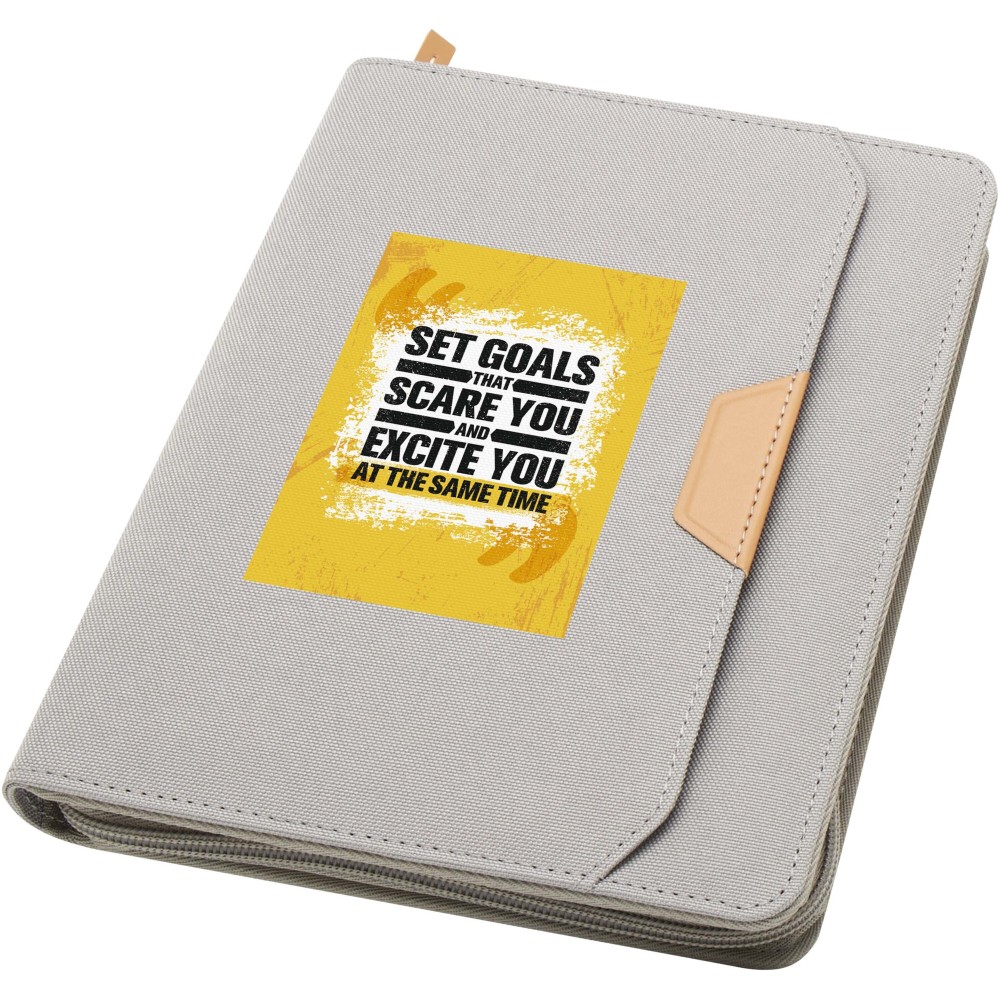 A Nomumi A5 portfólió lekerekített sarkú, újrahasznosított műanyagból készült, praktikus irodai alapdarab. 64 db krém színű, 80 g/m2 vonalas lapot tartalmaz, cipzáros záródással, tollhurokkal és egy zsebbel rendelkezik. Emblémázás: Szitanyomás