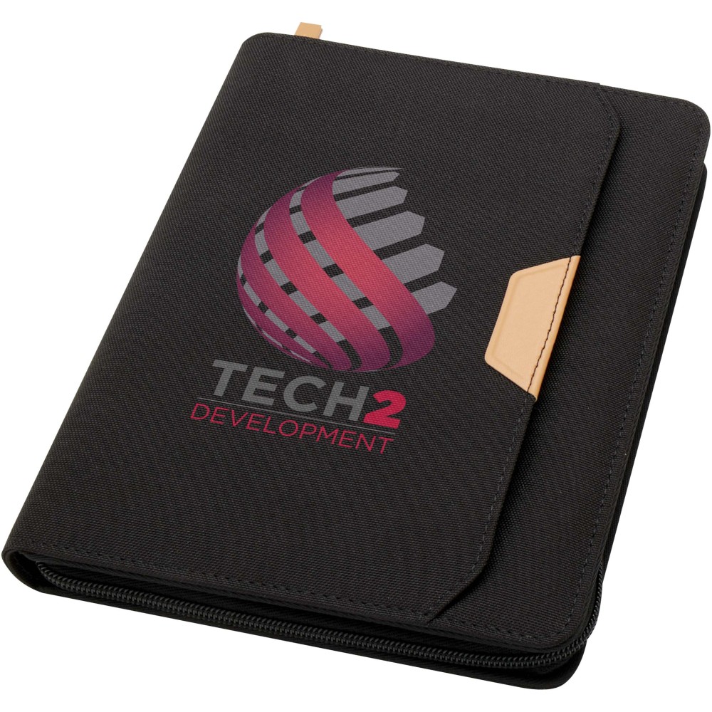 A Nomumi A5 portfólió lekerekített sarkú, újrahasznosított műanyagból készült, praktikus irodai alapdarab. 64 db krém színű, 80 g/m2 vonalas lapot tartalmaz, cipzáros záródással, tollhurokkal és egy zsebbel rendelkezik. Emblémázás: Szitanyomás