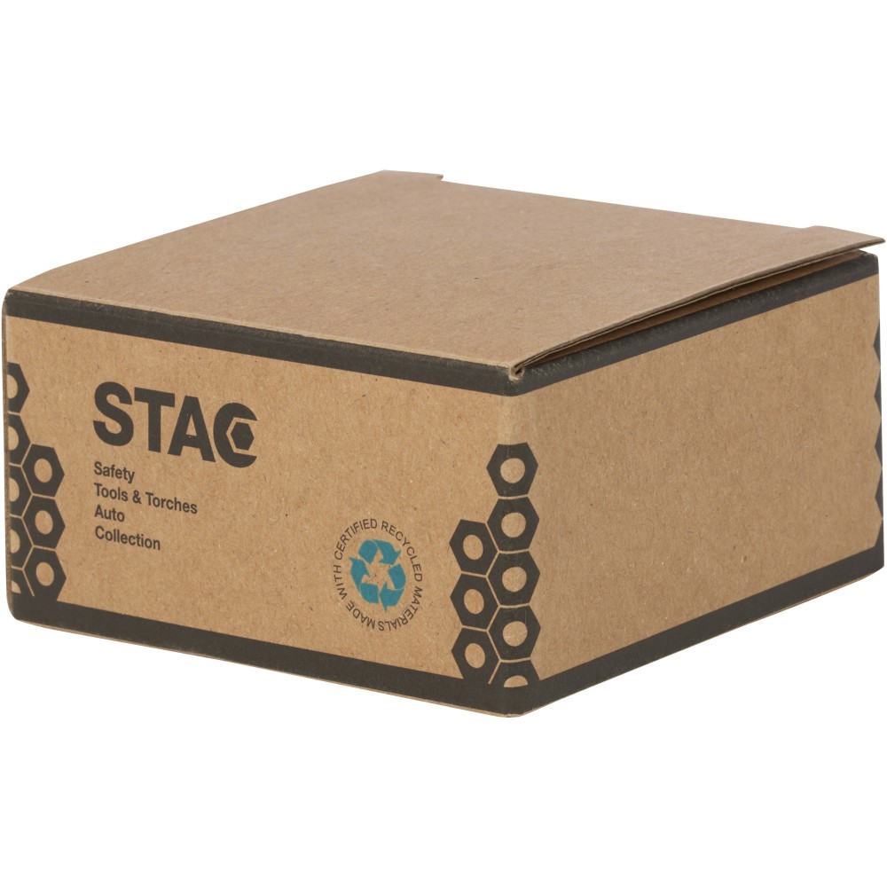 3 méteres mérőszalag övcsipesszel és poliészter csuklópánttal. Centimétert és hüvelyk egységeket tartalmaz. A tok 21% RCS tanúsítvánnyal rendelkező újrahasznosított műanyagból és 4% újrahasznosított TPE-ből készült. A Recycled Claim Standard (RCS) a termék újrahasznosított tartalmát a teljes ellátási láncban ellenőrzi. Fenntartható forrásból származó STAC díszdobozba csomagolva. Emblémázás: Matricázás, Tamponnyomás