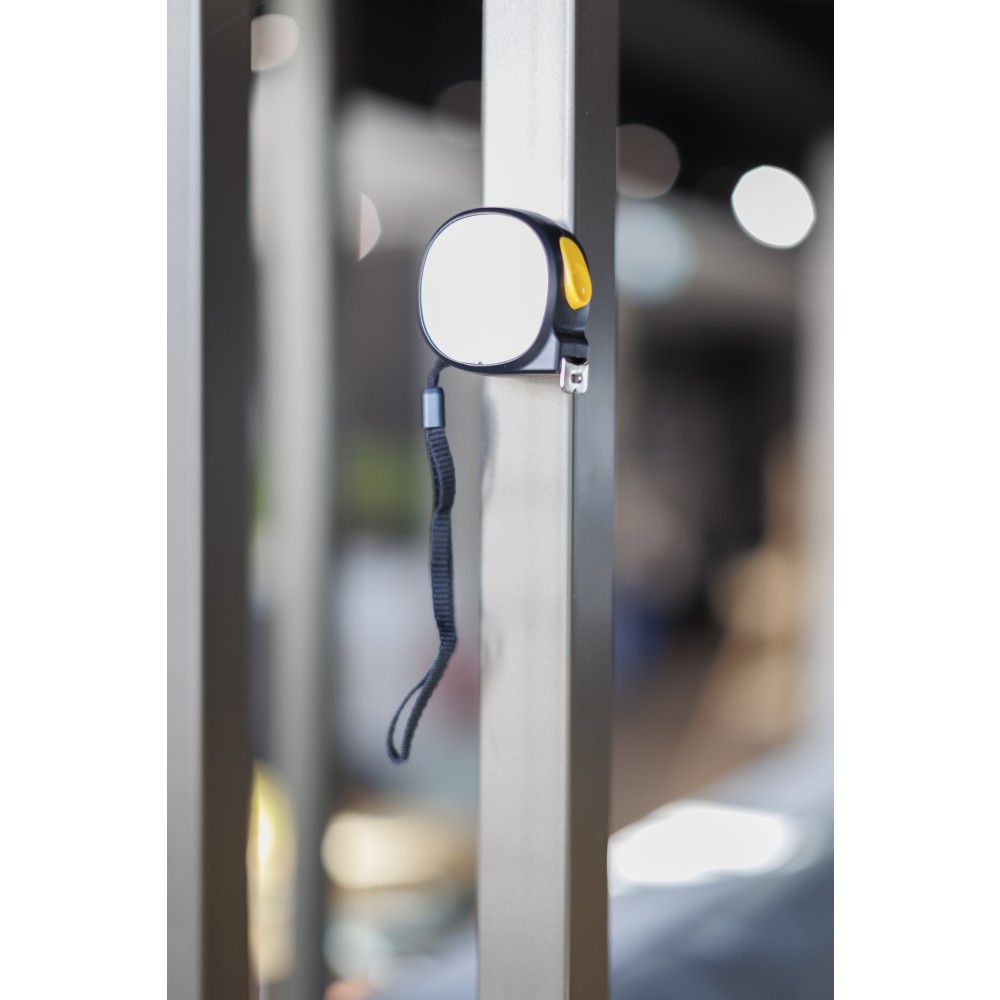 ABS műanyagból készült mérőszalag mágneses oldallal, 5 m hosszúságú és 19 mm szélességű fém szalaggal, centiméter- és inch-beosztással. Felül elhelyezett nyomógomb a rögzítéshez/kioldáshoz, valamint poliészter csuklópánt. Egyenként csomagolva illusztrációval ellátott barna kartondobozban.