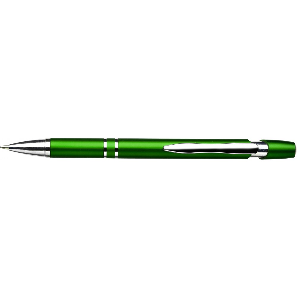 Műanyag golyóstoll metálos fényű tolltesttel, króm kiegészítőkkel, kék tollbetéttel. Emblémázás: Tamponnyomás, UV nyomtatás