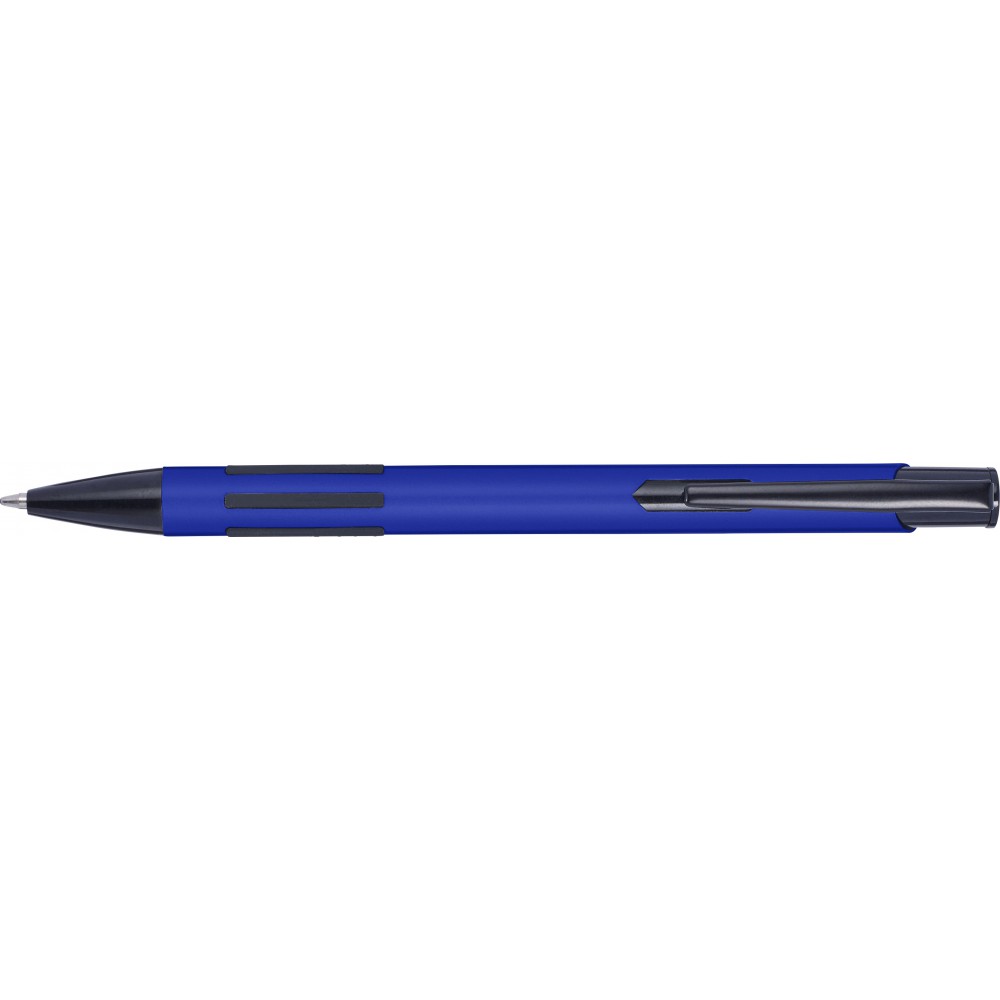 Golyóstoll lakkozott felülettel, nyomógombbal, kék tollbetéttel. A klipsz, a hegy és a gumis fogófelület színe illeszkedő fekete., alumínium, PVC, gumi Emblémázás: Gravírozás, Tamponnyomás