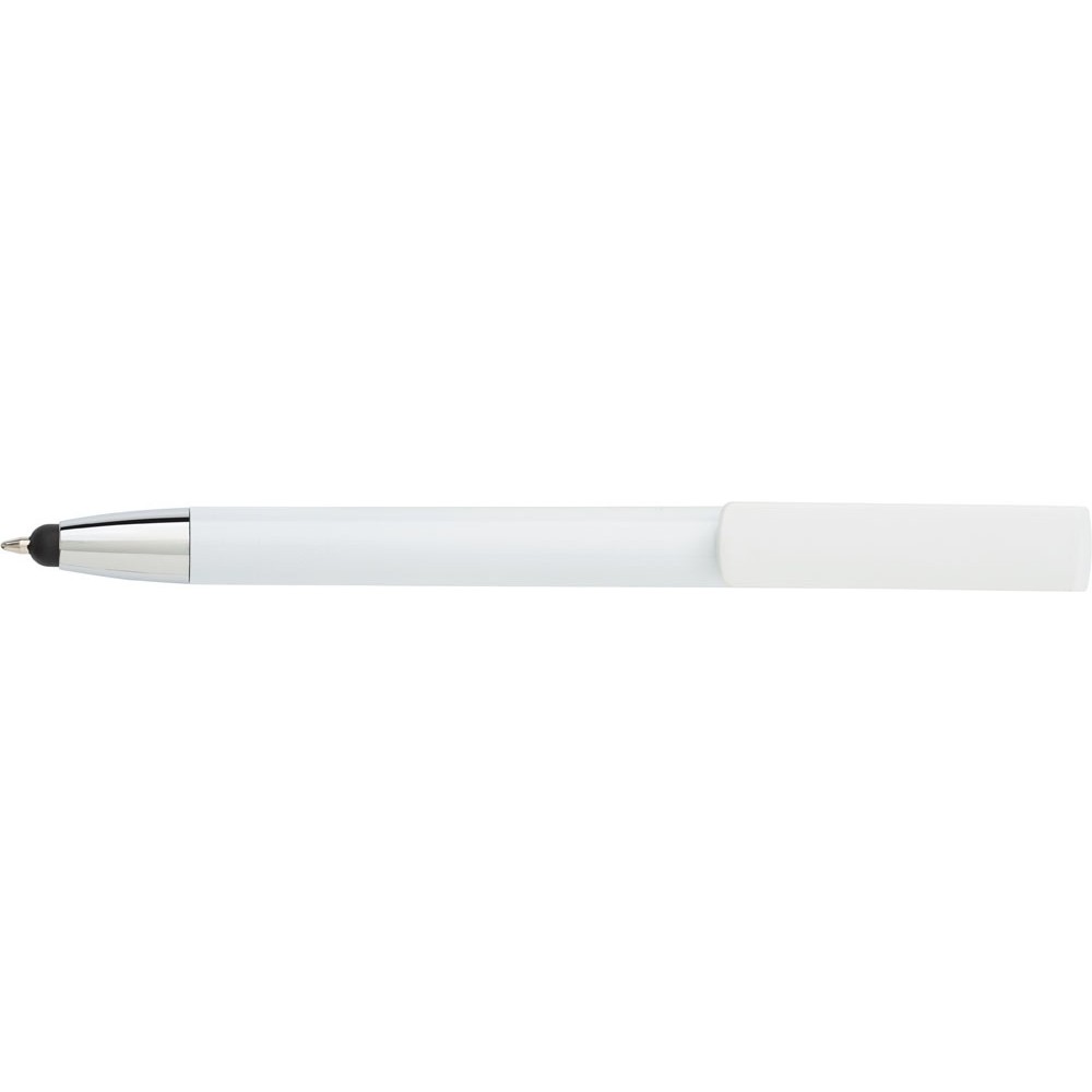 Golyóstoll érintővel, széles klipsszel, mely telefontartóként is használható, kék tollbetéttel. Műanyag. Emblémázás: Tamponnyomás, UV nyomtatás
