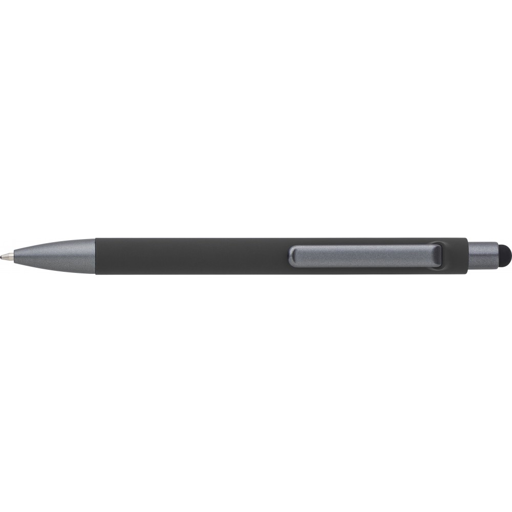 Golyóstoll gumis bevonattal, érintővel, kék tollbetéttel. ABS, PP műanyag, szilikon, vas. Emblémázás: UV nyomtatás