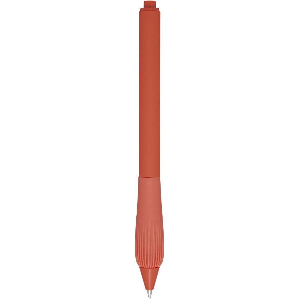 Újrahasznosított műanyag golyóstoll gumírozott tolltesttel és TPR anyagból készült fogórésszel. Fekete tollbetéttel. Írási hossz: 1000 méter. Hegyméret: 1,0 mm. Emblémázás: Tamponnyomás