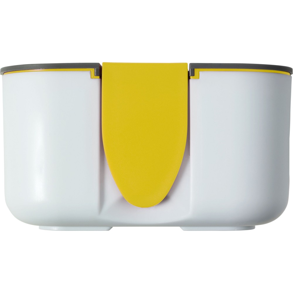 Ételdoboz egy belső elválasztóval. A fedélen lévő zárószerkezet telefontartóként is használható. Fedél nélkül mikrózható, csak a doboz. Űrtartalom: 850 ml. PP BPA-mentes műanyag. Emblémázás: Tamponnyomás, UV nyomtatás