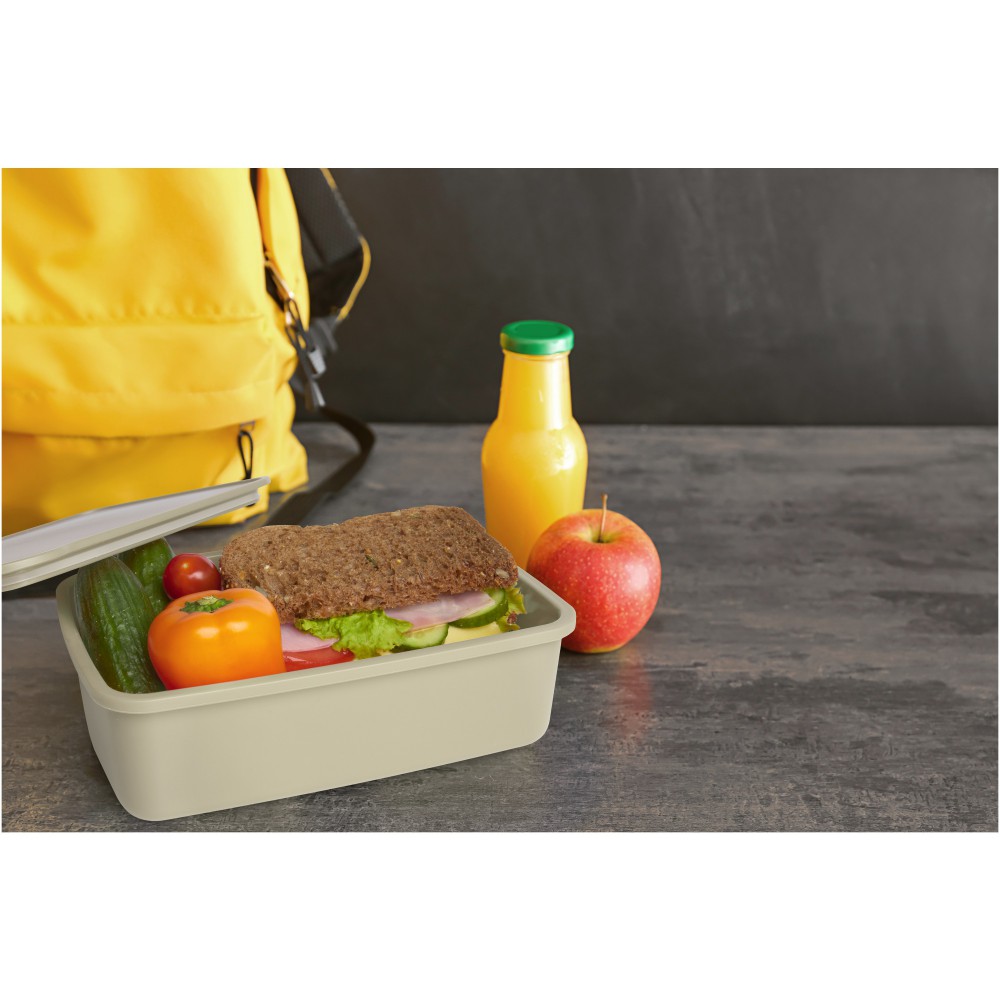 A 800 ml-es Dovi ebéddoboz 100%-ban újrahasznosított műanyagból készült, így fenntartható és trendi választás. Elasztikus szalaggal záródik, amely biztonságosan a helyén tartja a fedelet útközben. Emblémázás: UV nyomtatás
