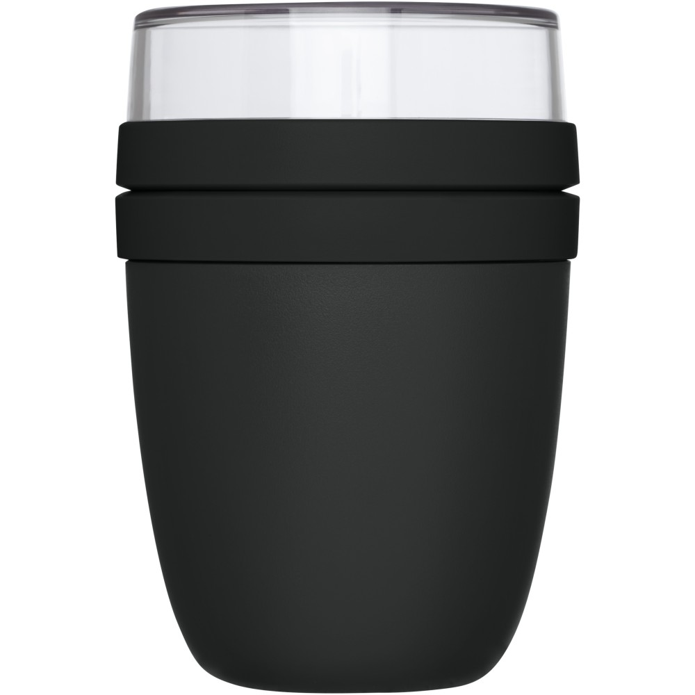 Ételtartó edény két rekesszel. Mindkét tartálynak külön fedele van. A felső, átlátszó rész űrtartalma 200 ml. Az alsó edény 500 ml-es. Fagyasztóba, mikrohullámú sütőbe (fedél nélkül), és mosogatógépbe tehető. A felső, átlátszó rész nem tehető mikrohullámú sütőbe. Szivárgásmentes. BPA mentes. PP műanyag, PCTG műanyag. Emblémázás: Tamponnyomás
