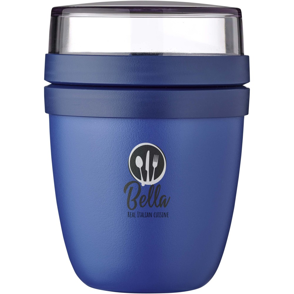 Az Ellipse Mini ételdoboz tökéletes különféle snackekhez, például joghurthoz müzlivel vagy leveshez krutonnal. Két praktikus rekesszel rendelkezik egy strapabíró tartályban, így az összetevőket szépen elkülönítheti egymástól. Kompakt mérete miatt ideális iskolatáskába való elhelyezésre, így gyors és kényelmes étkezést biztosít. A felső átlátszó tartály 120 ml-es, ideális körülbelül 50 gramm müzli vagy gyümölcs tárolására, az alsó tartály pedig 300 ml-es. Szivárgásmentes és mosogatógépben mosható. BPA-mentes. Emblémázás: Tamponnyomás