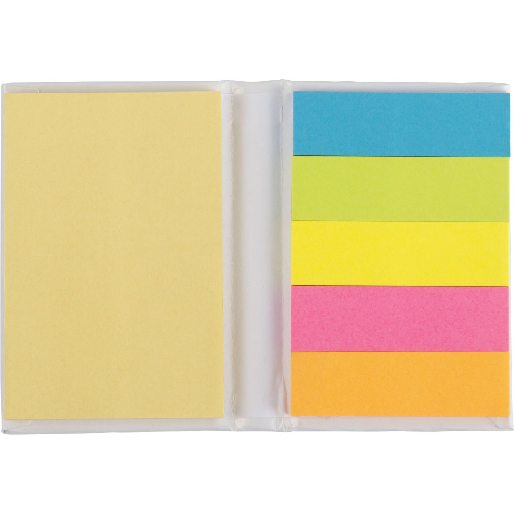 Öntapadó jegyzetlapkészlet keményfedelű tartóban. 50 db nagy öntapadós jegyzettömb lap és 5 különböző színű kis öntapadós jelölő, színenként 25 lap. 70g/m2. Emblémázás: Tamponnyomás