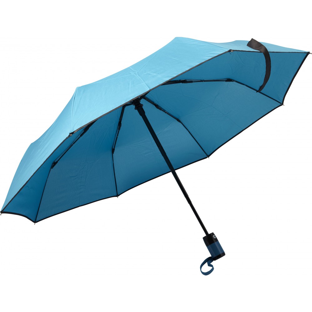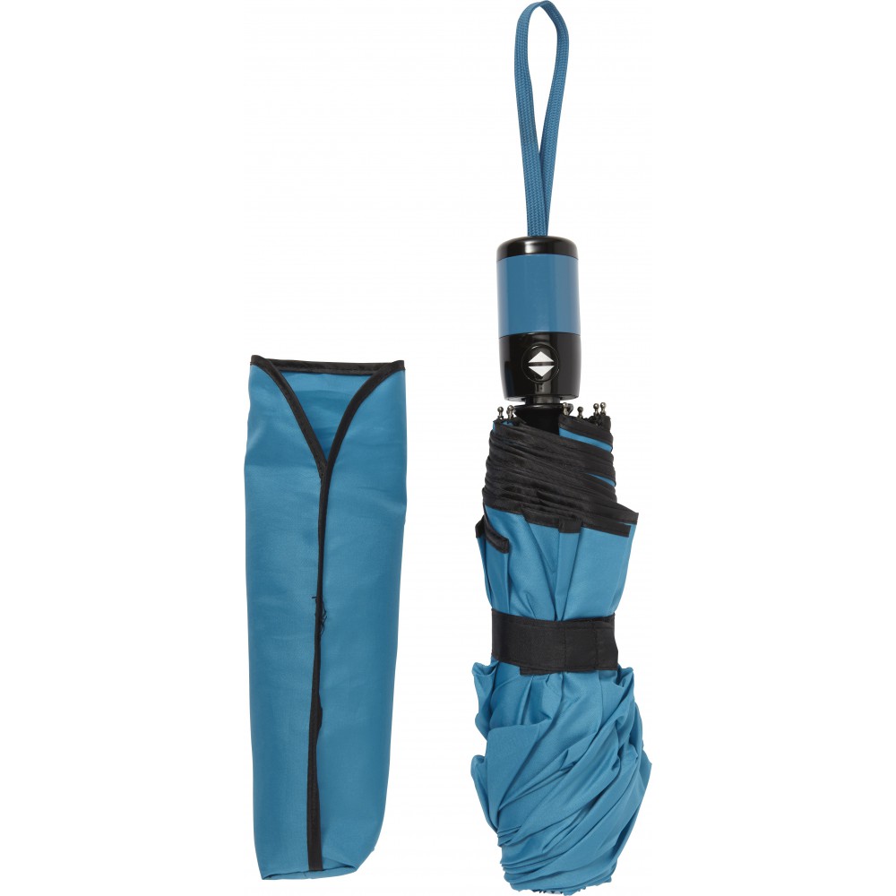 Összecsukható automata esernyő fém vázzal, üvegszálas bordákkal, műanyag fogóval, tokkal. Emblémázás: Szitanyomás