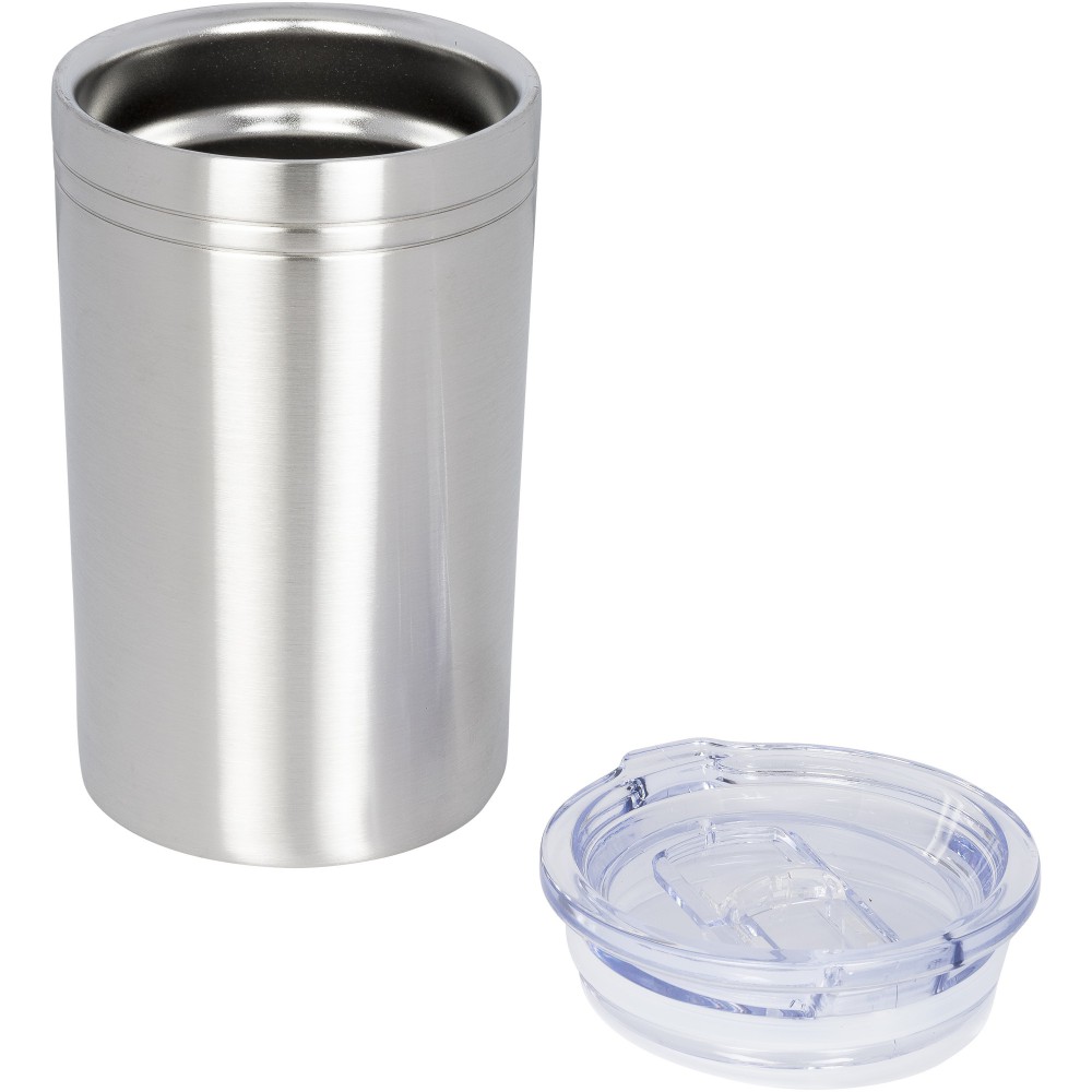Duplafalas, vákuumos kialakítás. Nem szivárgásmentes. Szénsavas italokkal nem használható. Mosogatógépben nem mosható és mikrohullámú sütőben történő melegítésre nem alkalmas. Átlátszó, rápattintható kupak, elcsúsztatható záródással. Űrtartalom: 330 ml. Emblémázás: Gravírozás, Körszita, Tamponnyomás