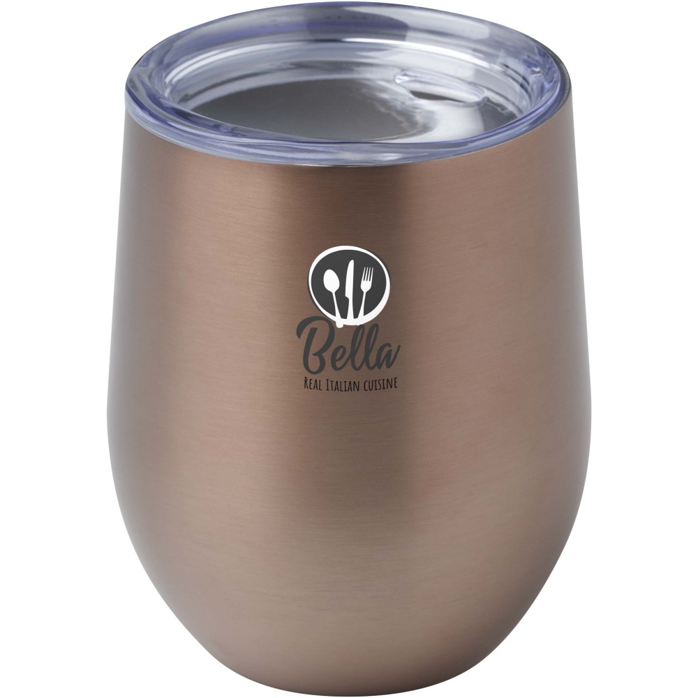 A Corzo RCS tanúsítvánnyal rendelkező rozsdamentes acélból készült, és duplafalú vákuum konstrukcióval rendelkezik réz szigeteléssel, amely 6 órán keresztül melegen, vagy 24 órán keresztül hidegen tartja az italokat. A konstrukció megakadályozza a kondenzációt a csésze külsején. Könnyen használható, nyomófedeles kialakítás. Az alsó részén porfestett bevonat található. Széles nyílás a kényelmes töltéshez és öntéshez. Űrtartalom: 350 ml. Újrahasznosított kartondobozban szállítjuk. Emblémázás: Gravírozás, Tamponnyomás