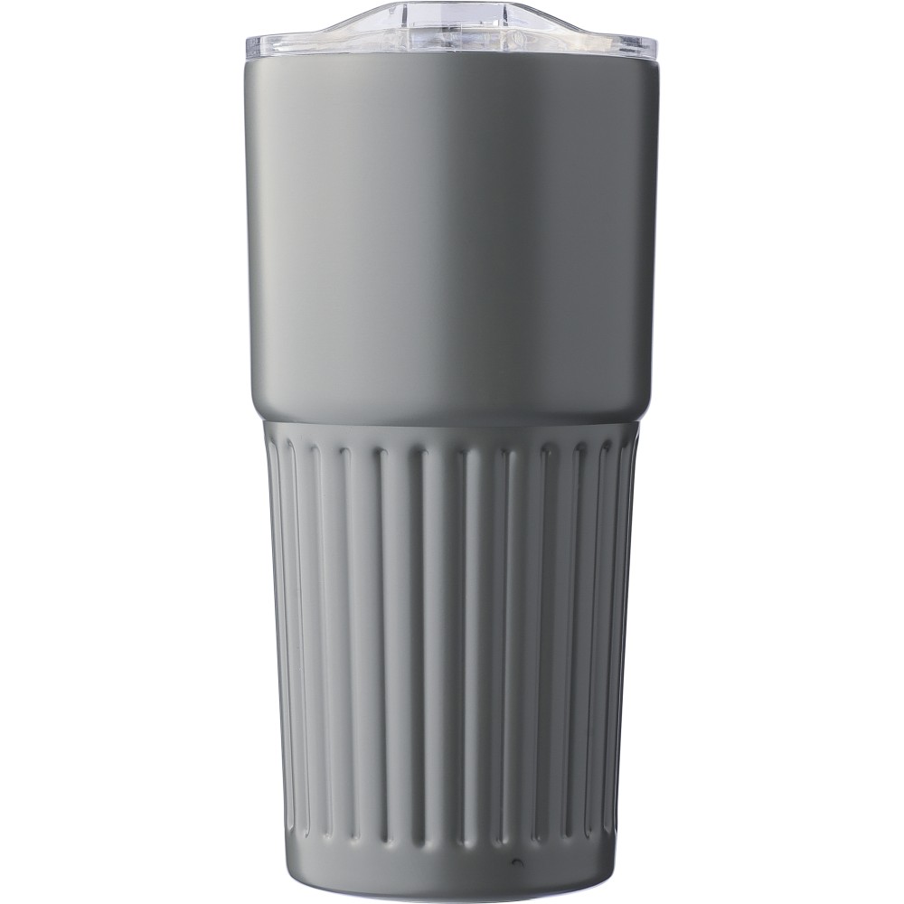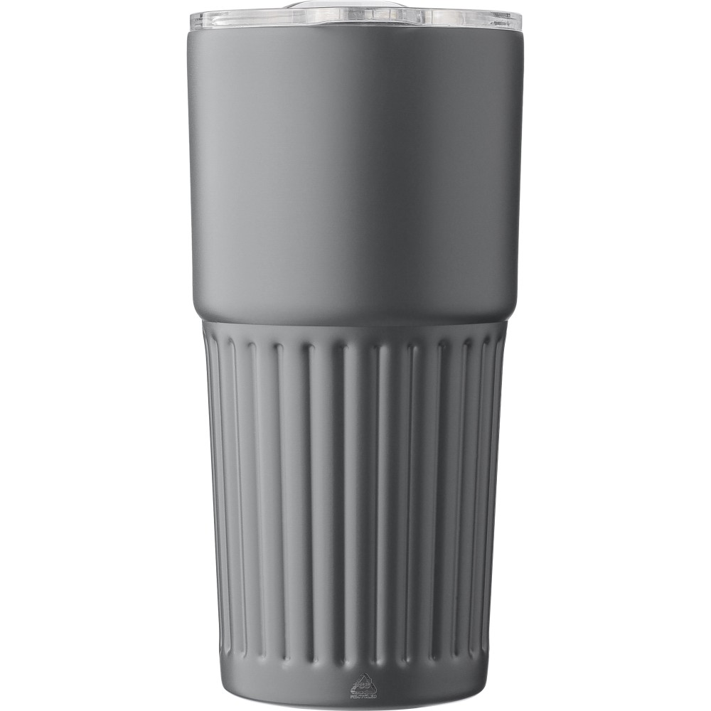 Újrahasznosított rozsdamentes acél útibögre, 450 ml. A belső 304-es, a külső 201-es rozsdamentes acélból készült, bordás markolattal, műanyag, csúszózáras fedéllel. Gravírozott újrahasznosított logó található a bögrén. Csomagolása barna papírdoboz. Emblémázás: Körszita