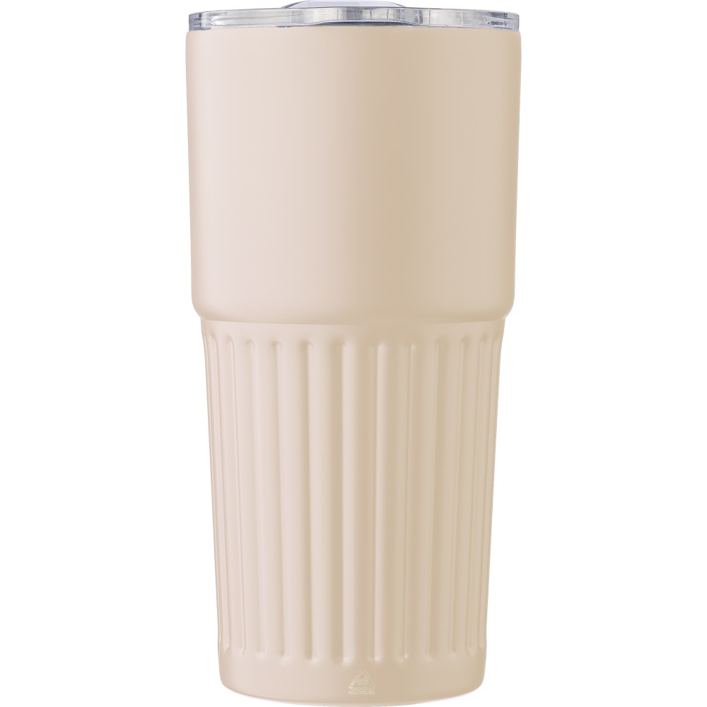 Újrahasznosított rozsdamentes acélból készült, duplafalú ivópohár (500 ml). Belső része 304-es, külső része 201-es rozsdamentes acél, bordázott fogófelülettel. AS fedéllel rendelkezik csúsztatható zárással. A palacktesten gravírozott recycled (újrahasznosított) alapanyagra utaló logó található. Darabonként barna kartondobozba csomagolva. Emblémázás: Körszita