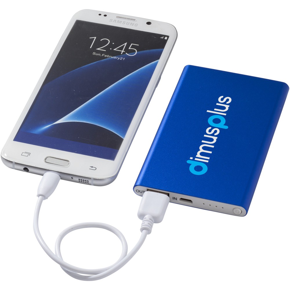 Pep powerbank 4000 mAh kapacitással, A lítium polimer akkumulátorral. Vékony, könnyű modell. A LED jelzőfény töltés közben jelzi a töltöttségi szintet, a kijelző pedig mutatja a maradék energiaszintet. Bemenet 5V/1A, kimenet 5V/1A. A USB / Micro-USB töltőkábelt tartalmazza. Csomagolása fehér doboz. Veszélyes áru, csomagban nem küldhető. Emblémázás: Gravírozás, Tamponnyomás, UV nyomtatás