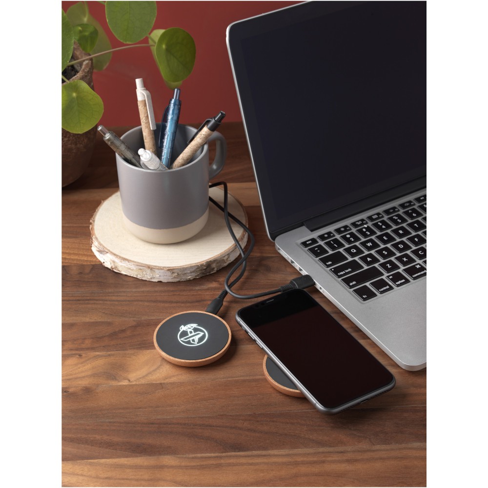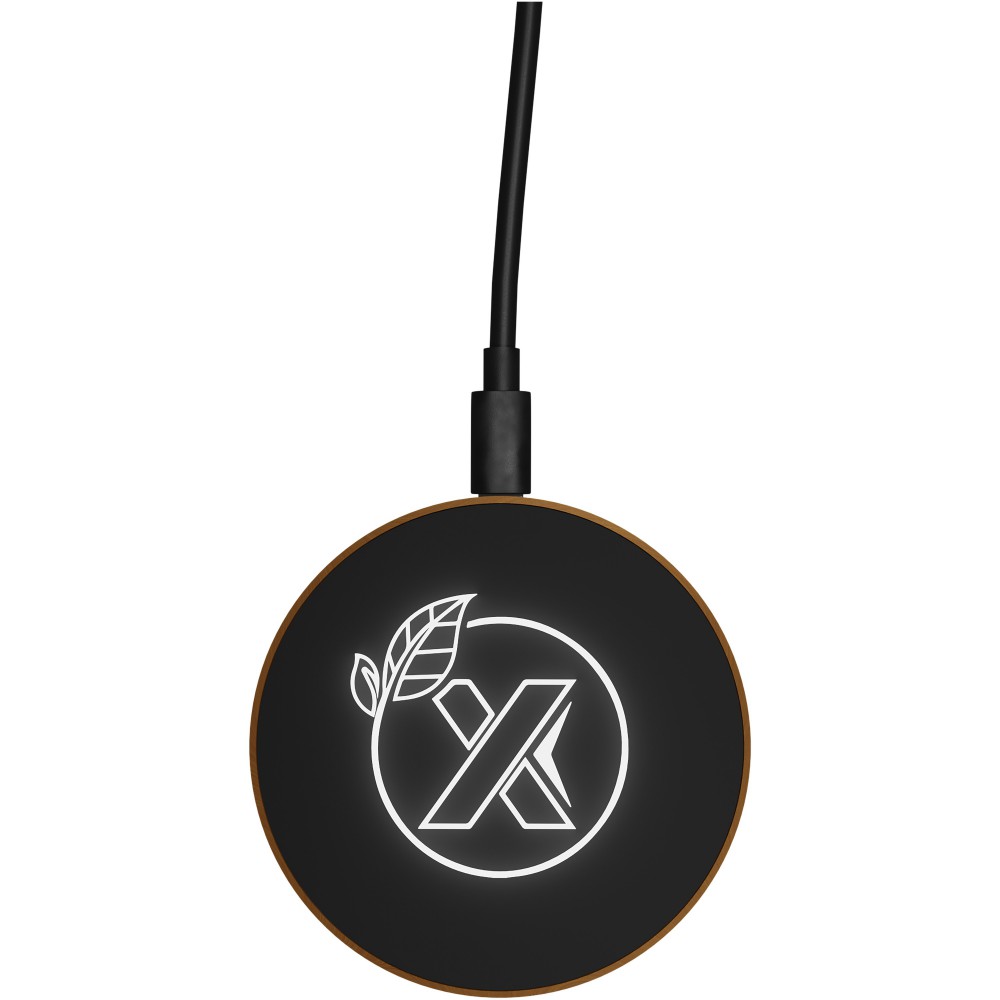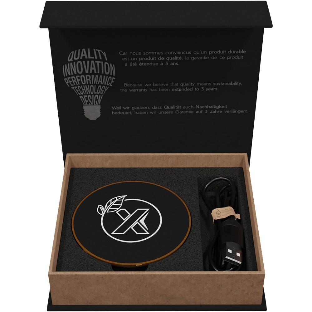 10 W-os vezeték nélküli töltőállomás gumiból és fából, valamint újrahasznosított PET műanyagból készült töltőkábel. Világító logóval emblémázható. Újrahasznosított papírból készült fekete kraft díszdobozban, mágneses zárószerkezettel szállítjuk. EUROPE EUIPO szabadalom. Emblémázás: Gravírozás