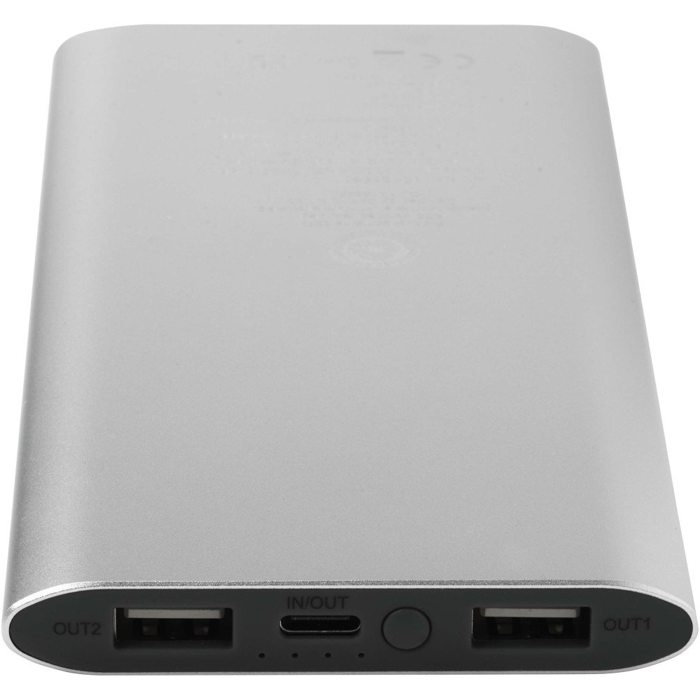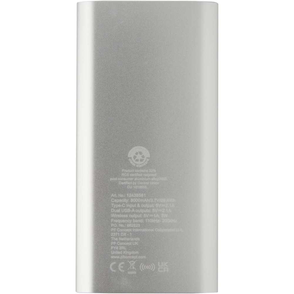Powerbank Type-C bemeneti/kimeneti porttal és 2 db USB-A porttal, amelyek lehetővé teszik három eszköz egyidejű töltését. Támogatja az 5W vezeték nélküli töltést minden Qi-kompatibilis eszköz számára. A powerbank 8000 mAh kapacitású lítium-polimer akkumulátorral rendelkezik, amely max. 10W teljesítményt biztosít. A powerbank 28%-ban RCS tanúsítvánnyal rendelkező újrahasznosított műanyagból készült. TPE Type-C - USB-A töltőkábellel szállítjuk. Emblémázás: Gravírozás, Tamponnyomás, UV nyomtatás