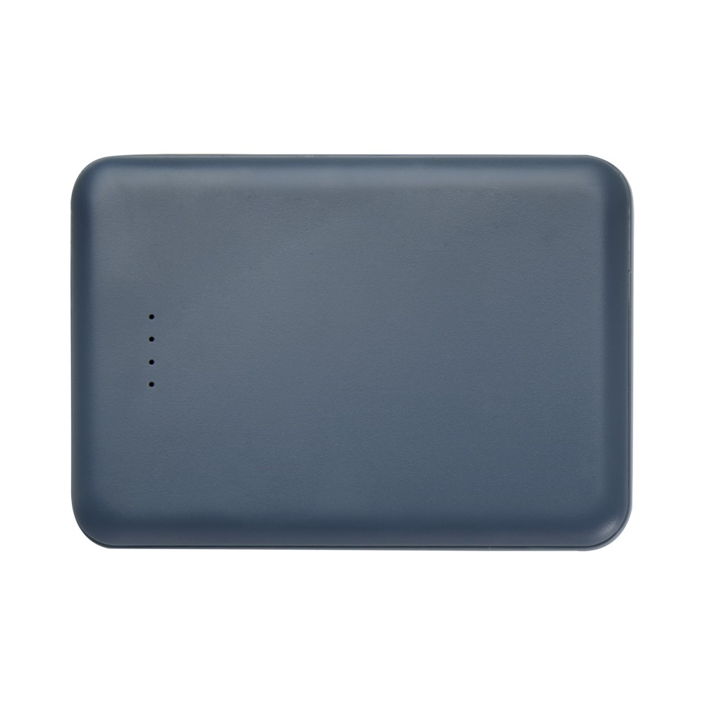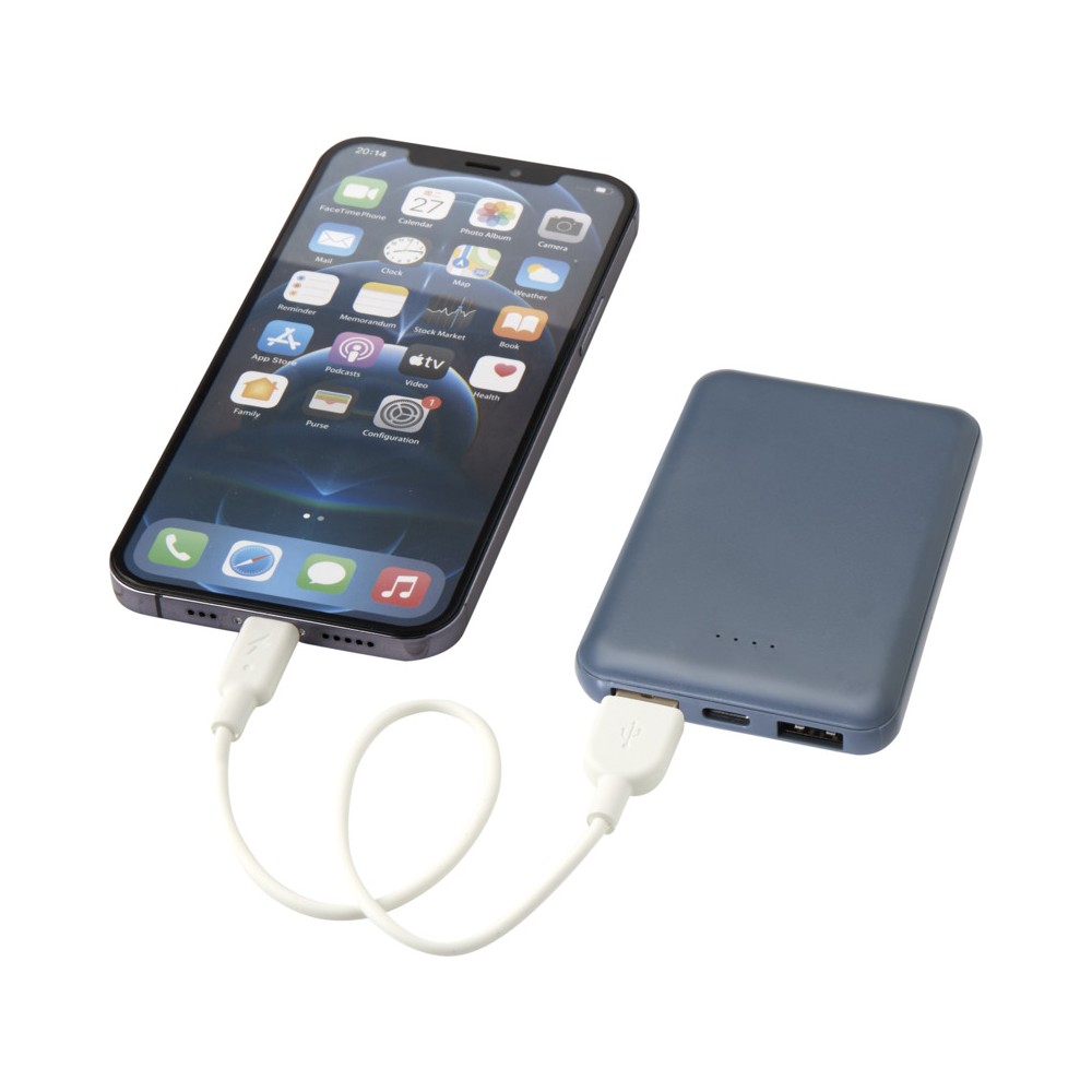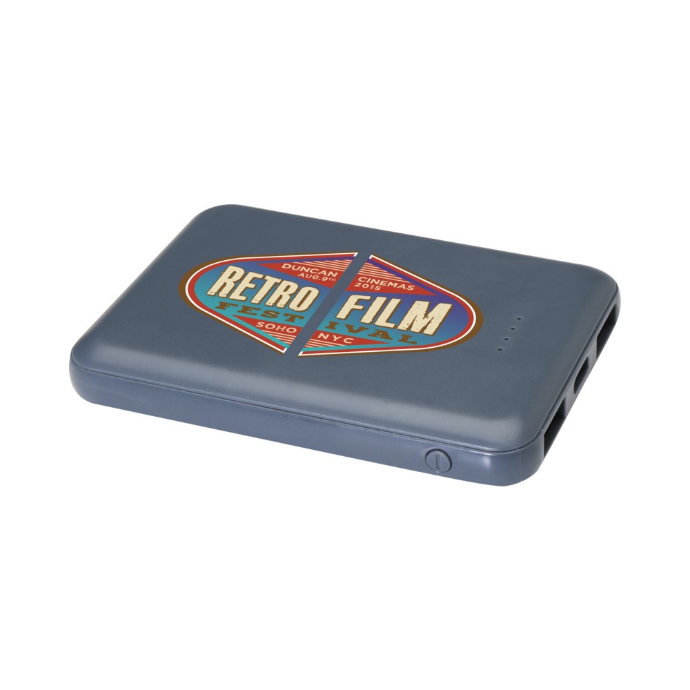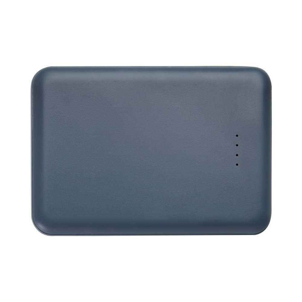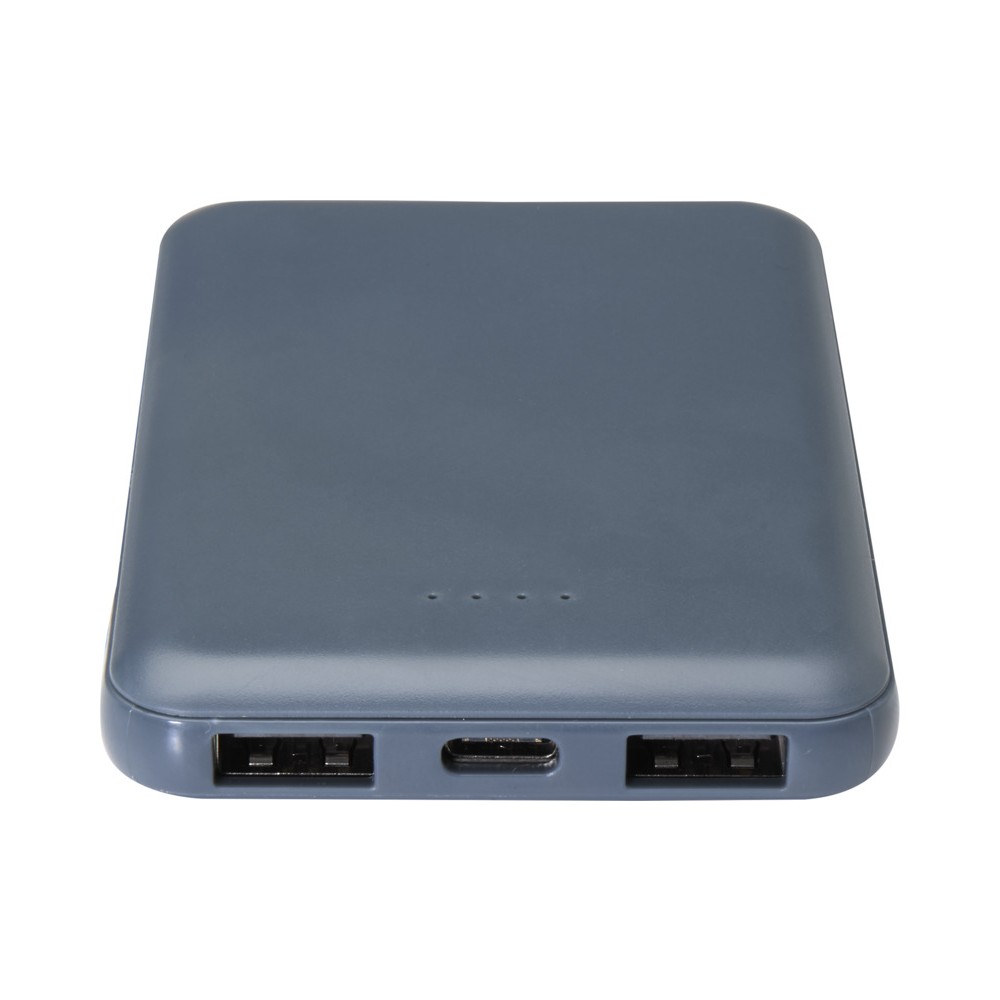 Karcsú és elegáns kialakítású powerbank, Type-C bemeneti/kimeneti porttal és 2 db USB-A porttal, amelyek lehetővé teszik három eszköz egyidejű töltését. A powerbank 5000 mAh kapacitású lítium-polimer akkumulátorral rendelkezik, amely max. 10W teljesítményt biztosít. A powerbank 23%-ban RCS tanúsítvánnyal rendelkező újrahasznosított műanyagból készült. TPE Type-C - USB-A töltőkábellel szállítjuk. Emblémázás: Tamponnyomás