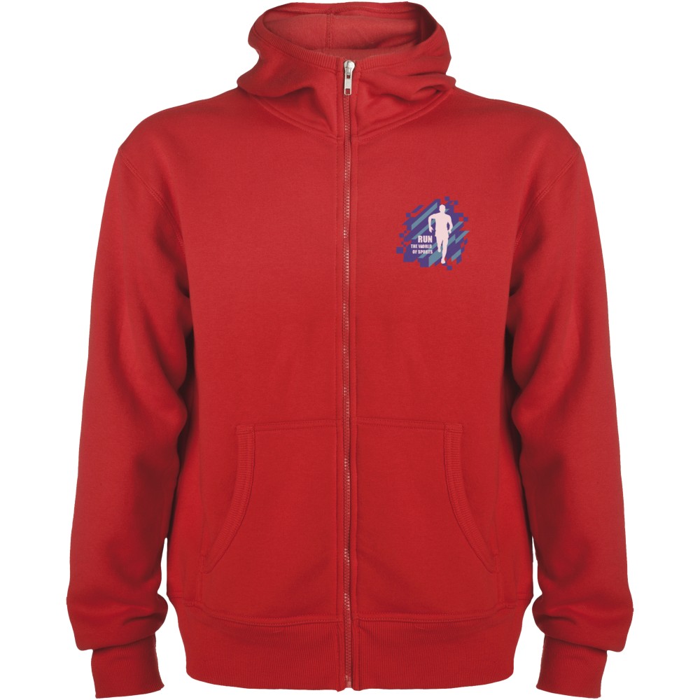 Magasnyakú, kapucnis pulóver teljes cipzárral. Bordázott részletek a kapucni és a zsebek szélén. Kenguru stílusú zseb. 2x2-es bordás kézelő és nyakpasszé. Gyerekméretekben is kapható. 50% pamut és 50% poliészter, 280 g/m2. Emblémázás: Hímzés, Szitanyomás