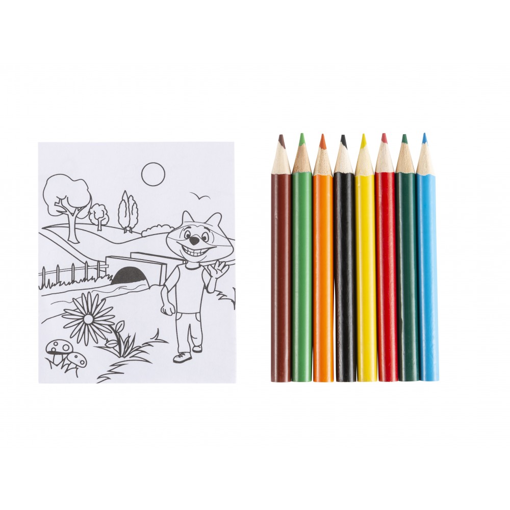 Színesceruza-készlet és kifestő 8 ceruzával és 20 színezőlappal átlátszó műanyag dobozban. Emblémázás: Tamponnyomás