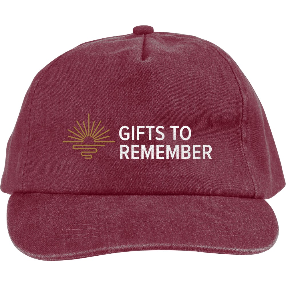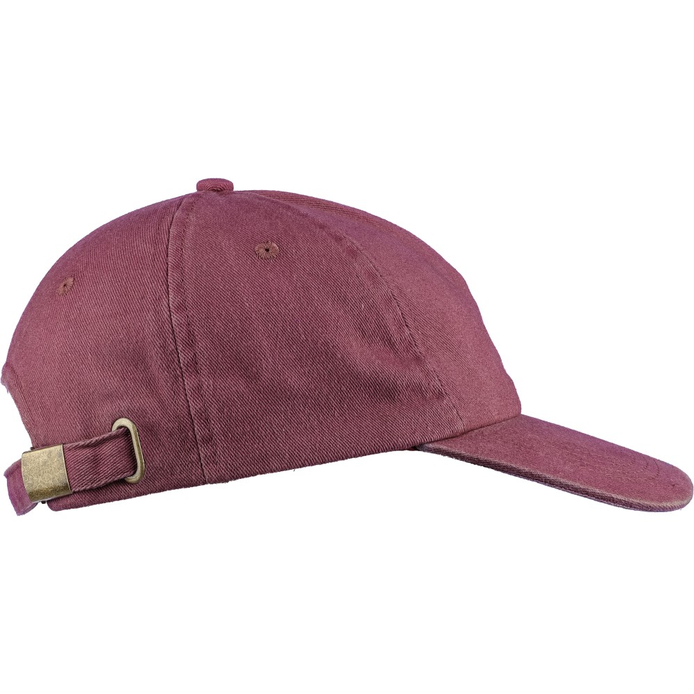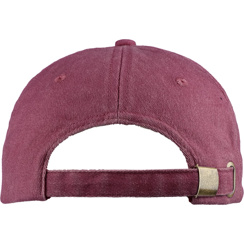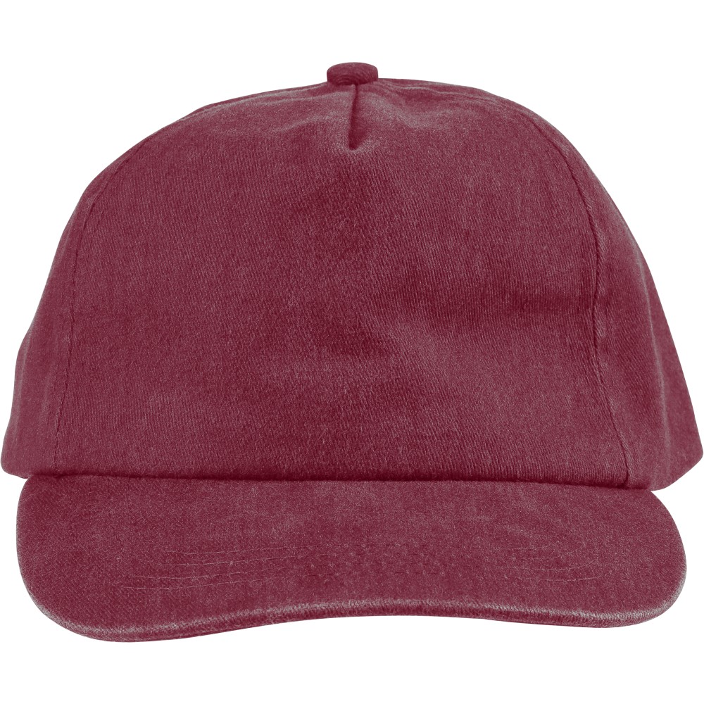 5 paneles baseballsapka 240 g/m2 vászon anyagból, koptatott hatású kivitelben, 7 cm-es ellenzővel, fémcsattal állítható pánttal. Bélés nélkül. Emblémázás: Hímzés, Szitanyomás