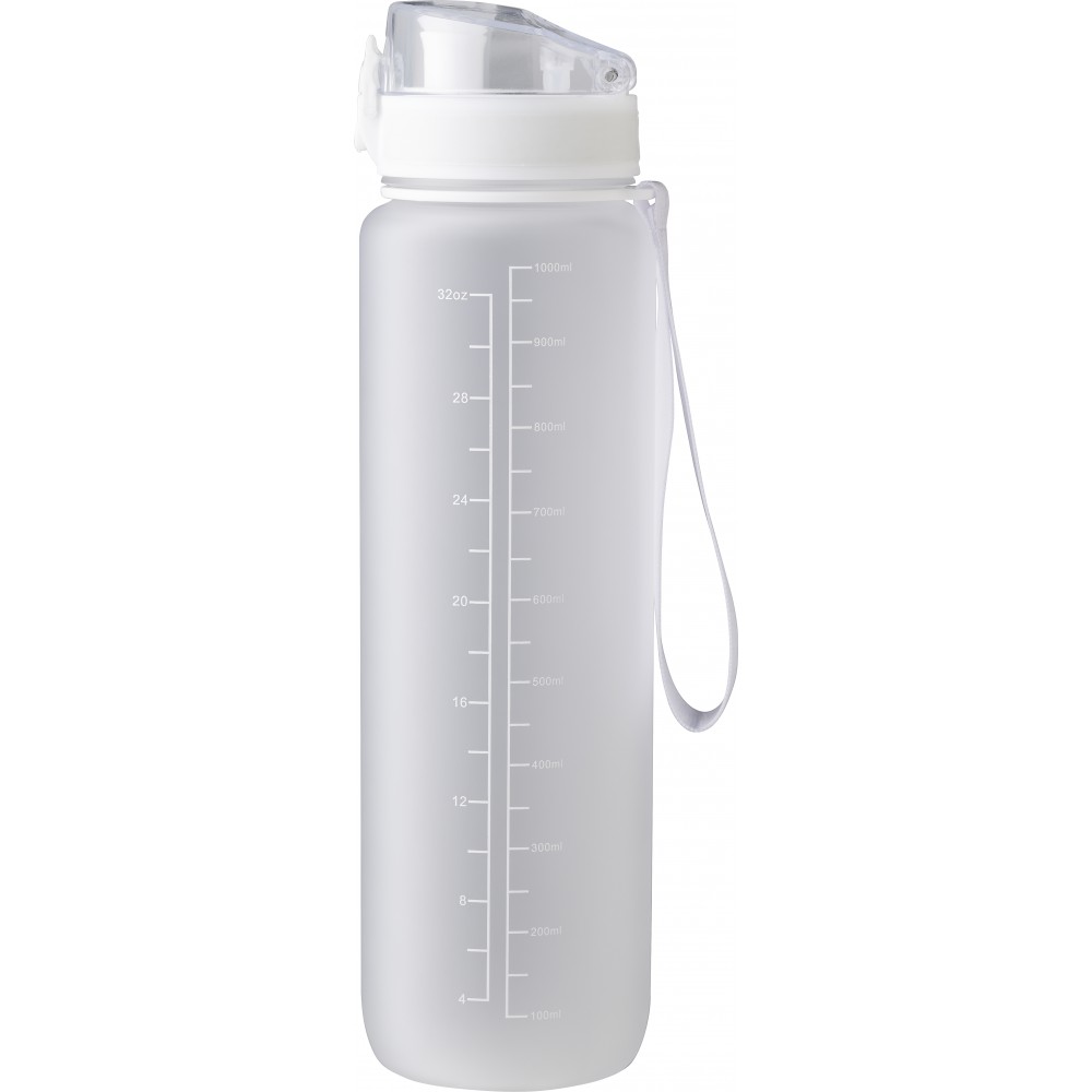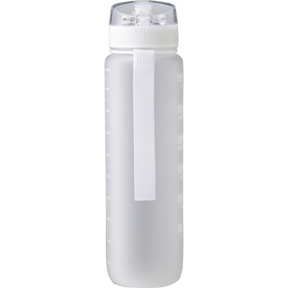 Műanyag motivációs palack szivárgásmentes kupakkal, csuklópánttal, matt bevonattal. Oldalán beosztással. Űrtartalom: 1 liter. Emblémázás: Körszita, Tamponnyomás, UV nyomtatás